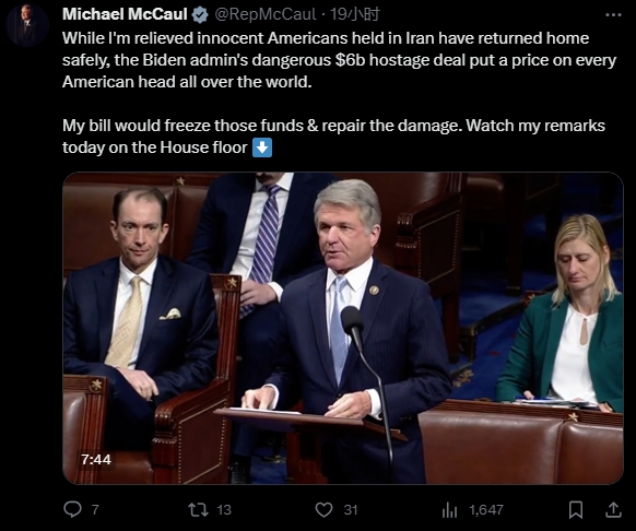 众议院外交事务委员会主席、共和党众议员迈克尔·麦考尔在一场辩论中表示:“在该地区如此不稳定的情况下,我们最不需要做的,就是让这60亿美元流向更多由伊朗支持的恐怖主义组织。”