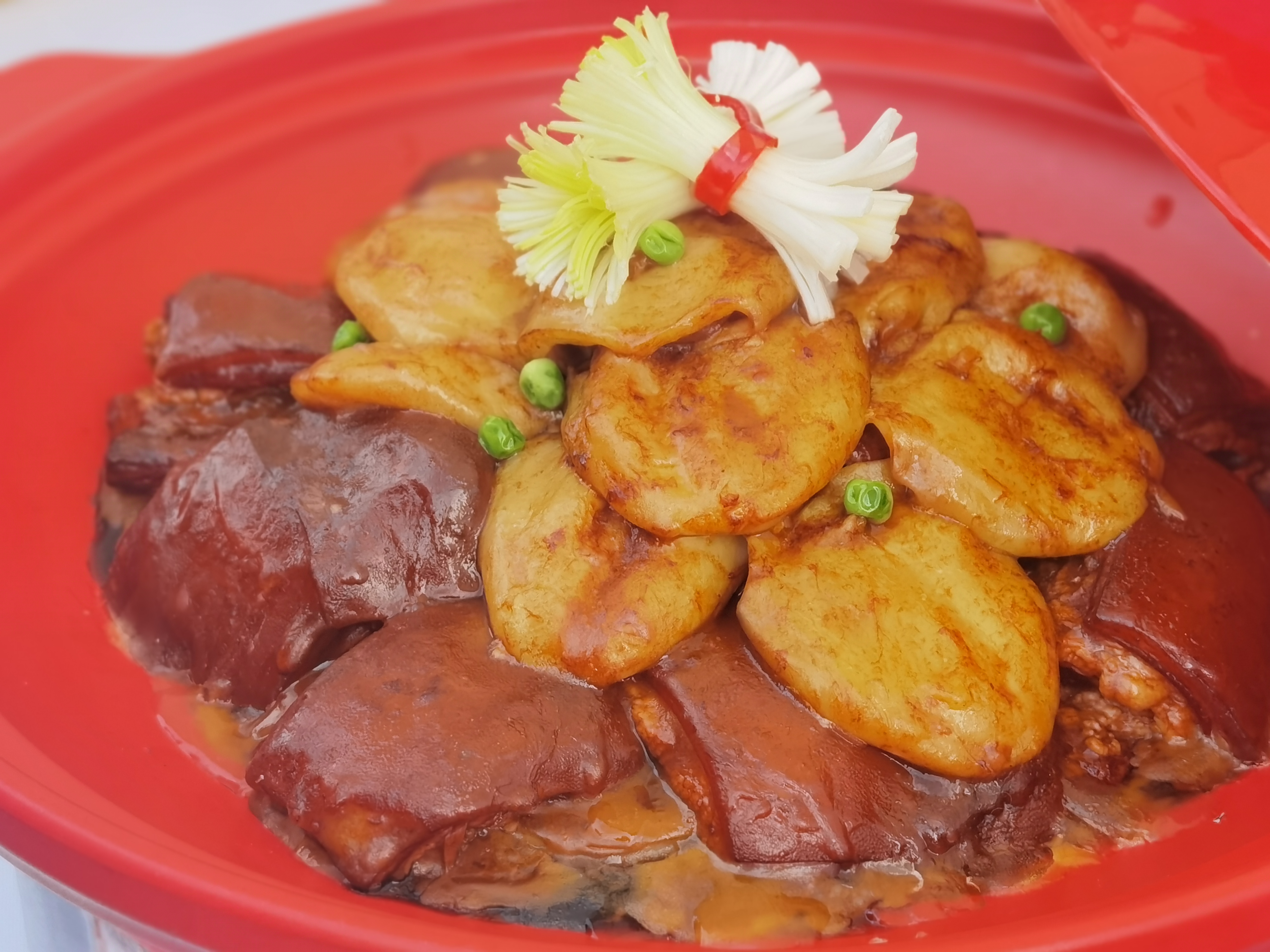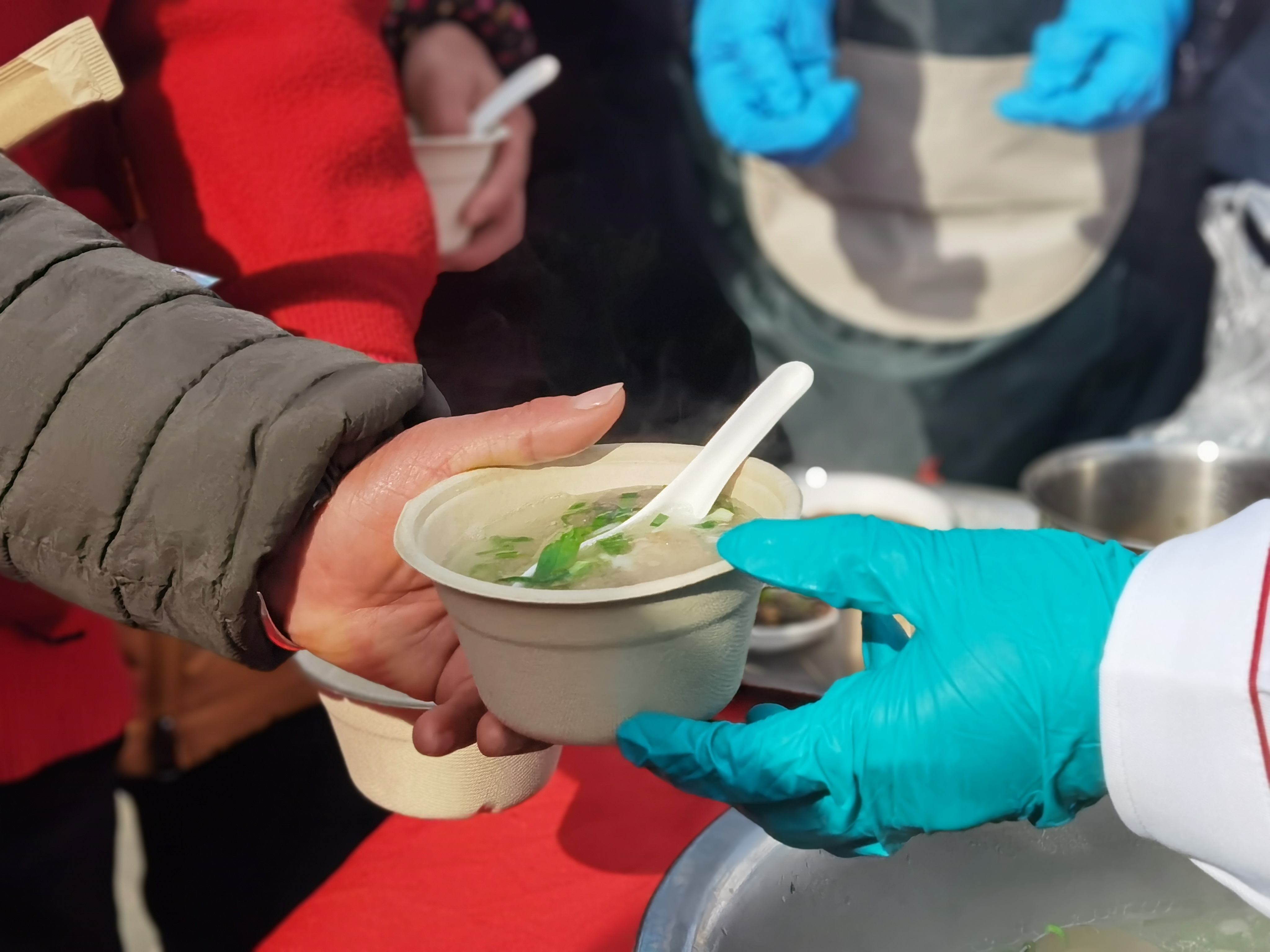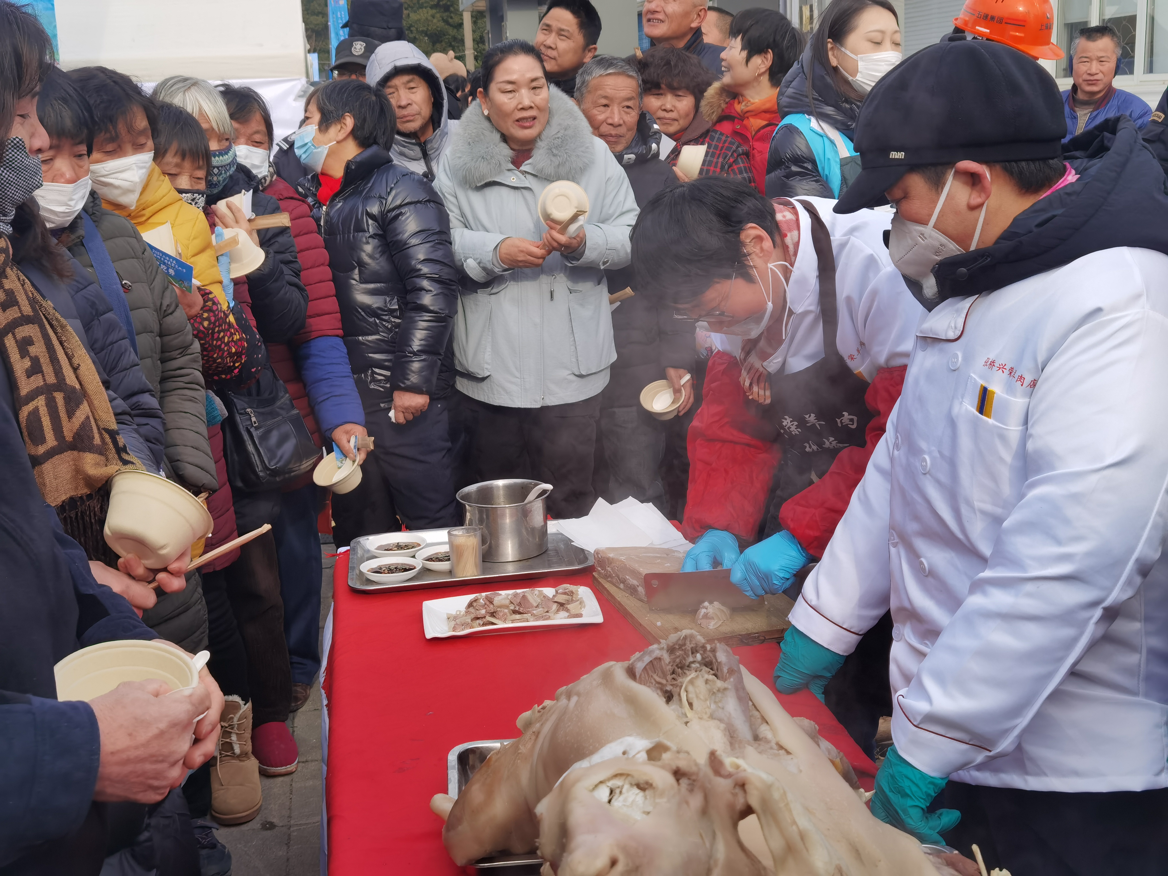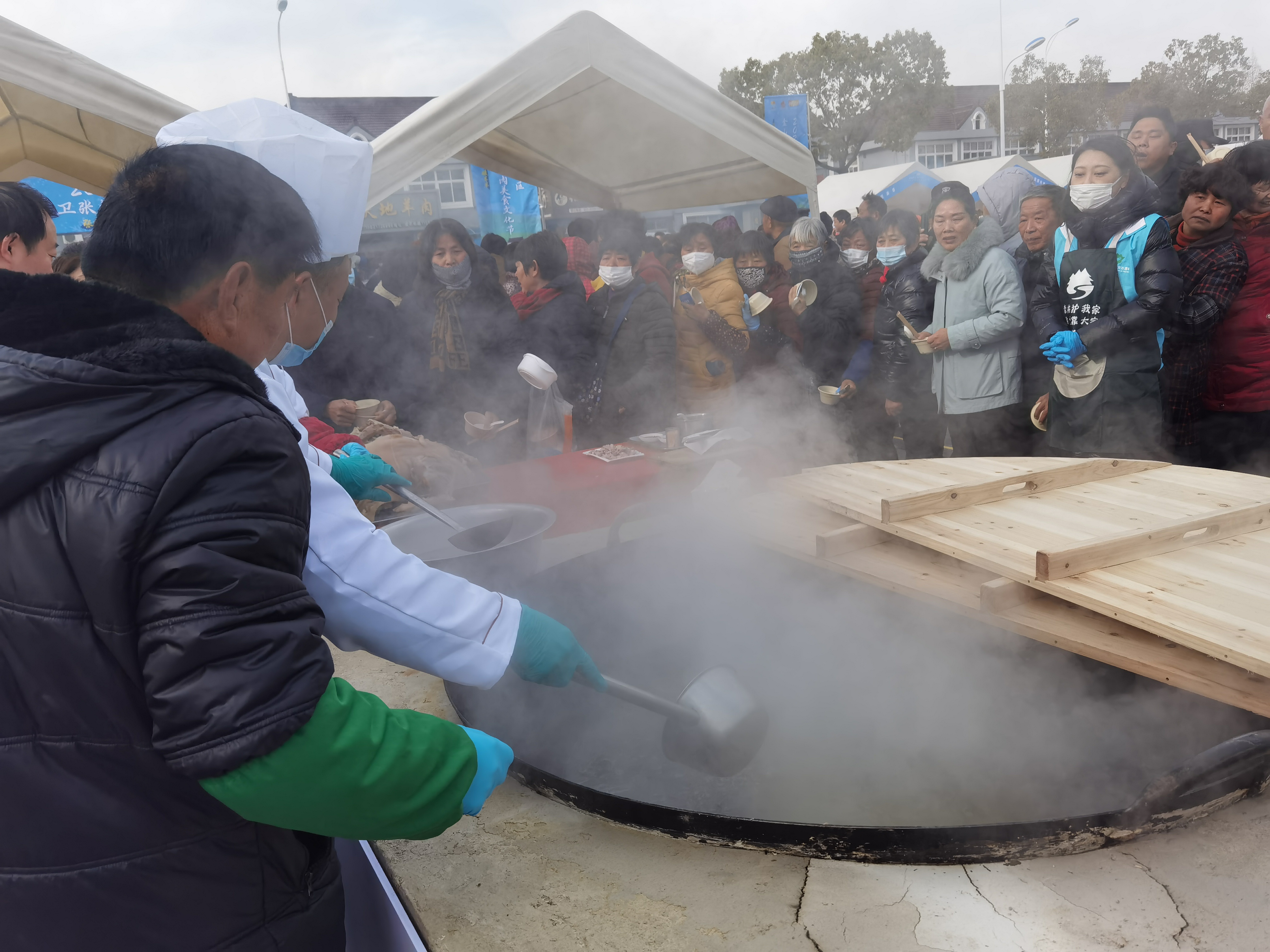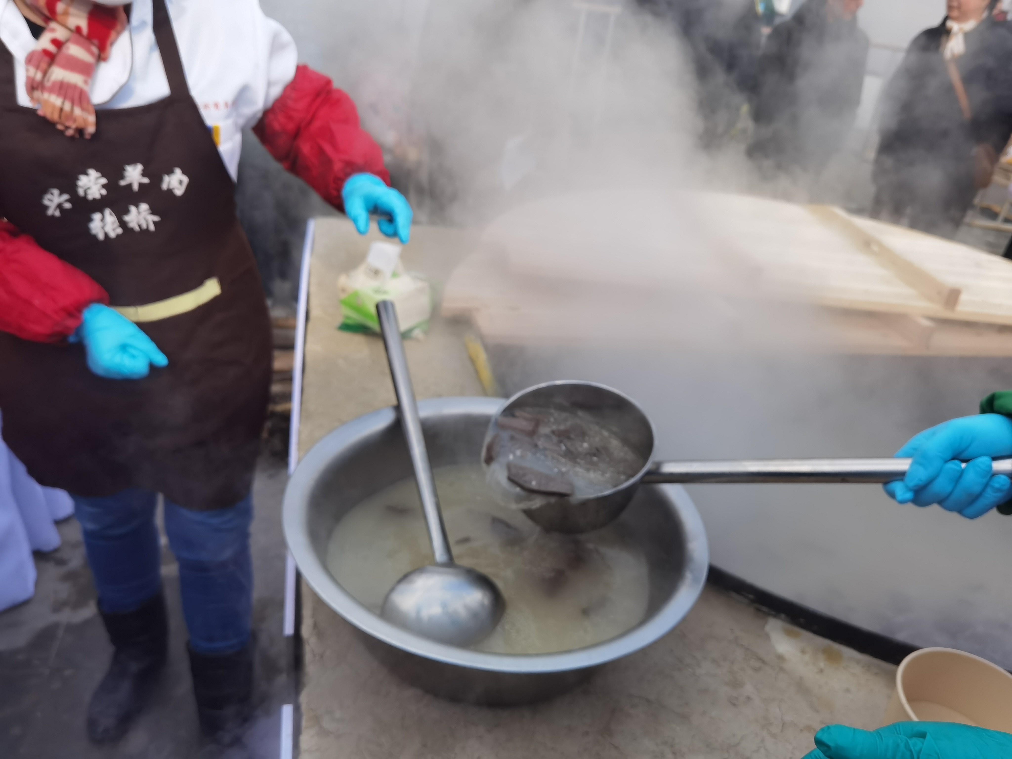 “我一大早就来了,这锅羊肉汤煮了两个半小时,里面的整羊有80多斤。我们店就在马路对面,尝了觉得味道好,欢迎到店里去吃。”兴荣羊肉店的老板在活动现场架起一口大锅,灶膛里火焰熊熊,灶壁上“天下一品羊”五个大字特别醒目,他一边盛着蒸腾着热气的羊肉汤,一边招呼着排队的乡亲和游客们。