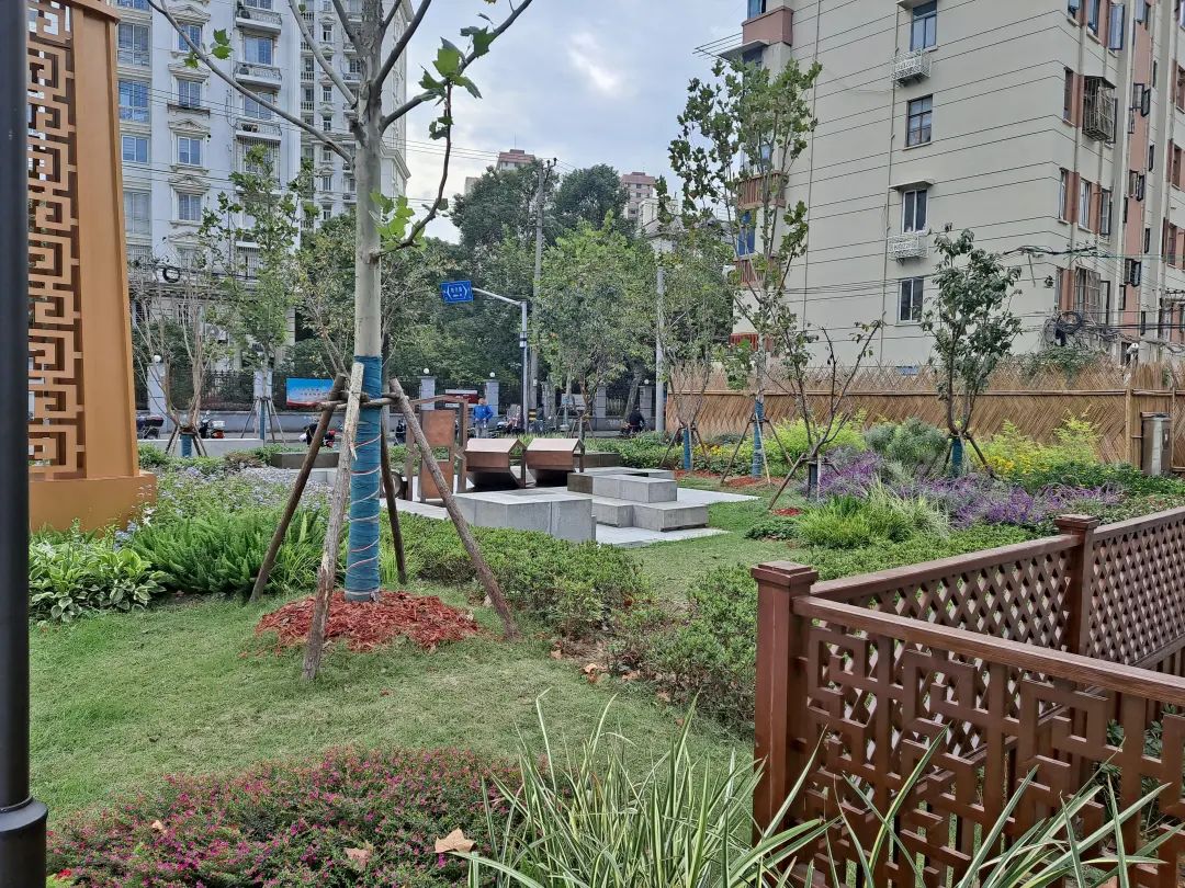 国网上海市电力公司金山供电公司单位附属绿地与周边公共绿地原本是封闭性绿地,本次改造将部分附属绿地与公共绿地融合设计并打开。