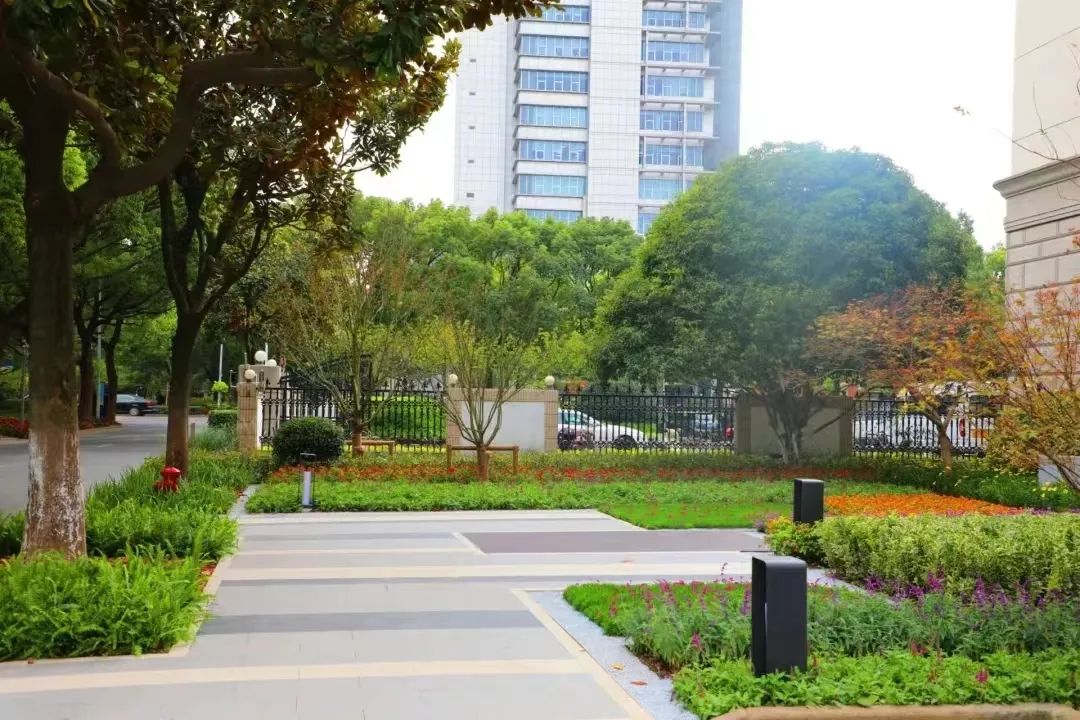 周边环境以社区文化及居住为主,绿化呈规整式乔木和集中式花径布局,保留了中心大草坪等原有风貌,种植樱花、梧桐、香樟,地被搭配金叶石菖蒲、玉簪、大麻叶泽兰等植物,最终形成上木有序、下木繁盛、疏密有致的绿化景观面貌。