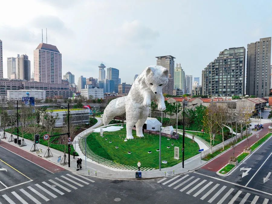 北极狐作为栖息在北极地区的珍稀动物,是灵敏、智慧、极致与守护的象征,也是充满生命与力量的北极生灵。《LET'S JUMP 跳跃吧!北极狐》以北极狐在冰原嬉戏时的灵动一跃为灵感,以高达20米的身姿定格在上海苏河湾万象天地公共绿地上的跳跃瞬间,将其寓意灵巧、智慧和极致的力量完美体现。
