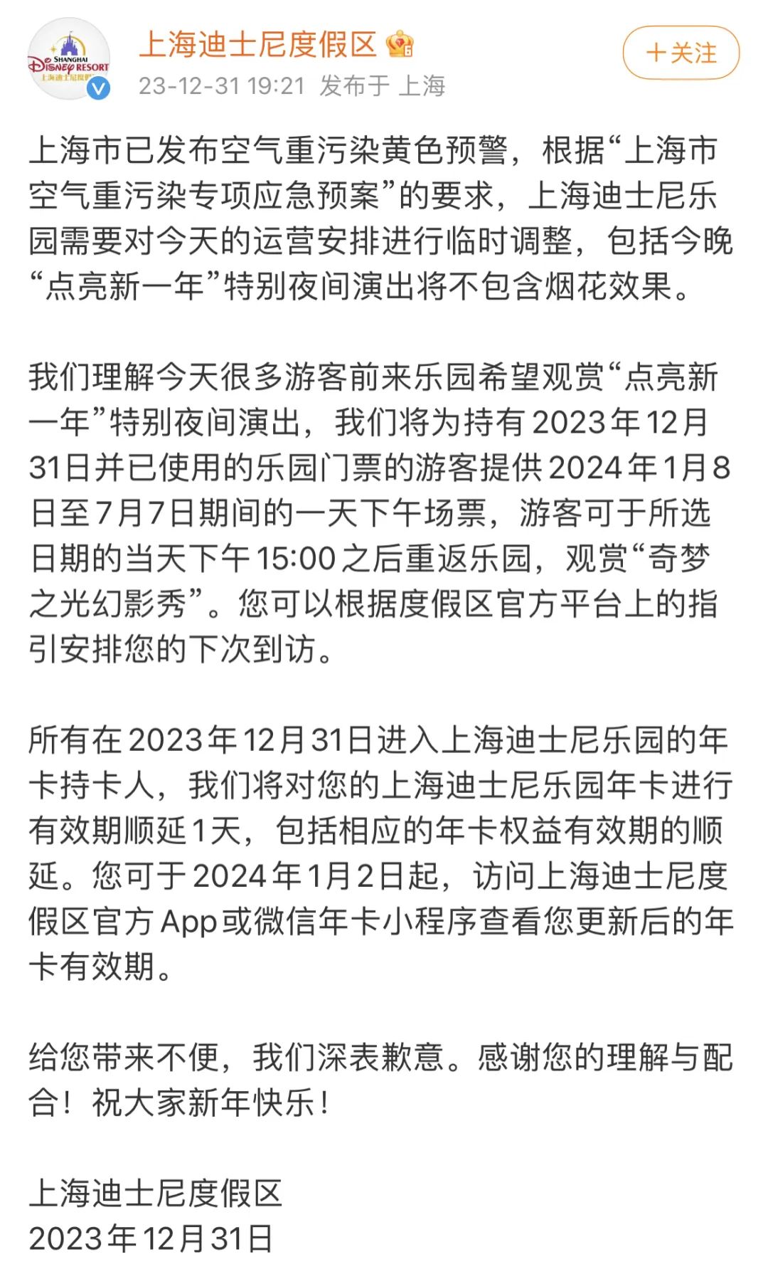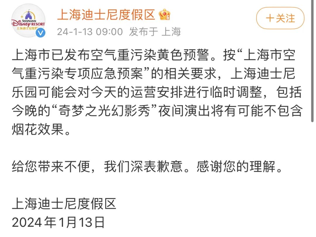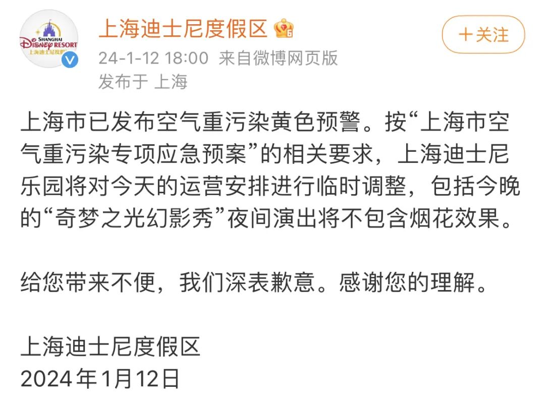 刚刚,上海迪士尼官博发布通知:因上海空气重污染达到黄色预警,根据相关要求,园区或将临时调整运营今晚的"奇梦之光幻影秀"夜间演出,可能不包含烟花效果。