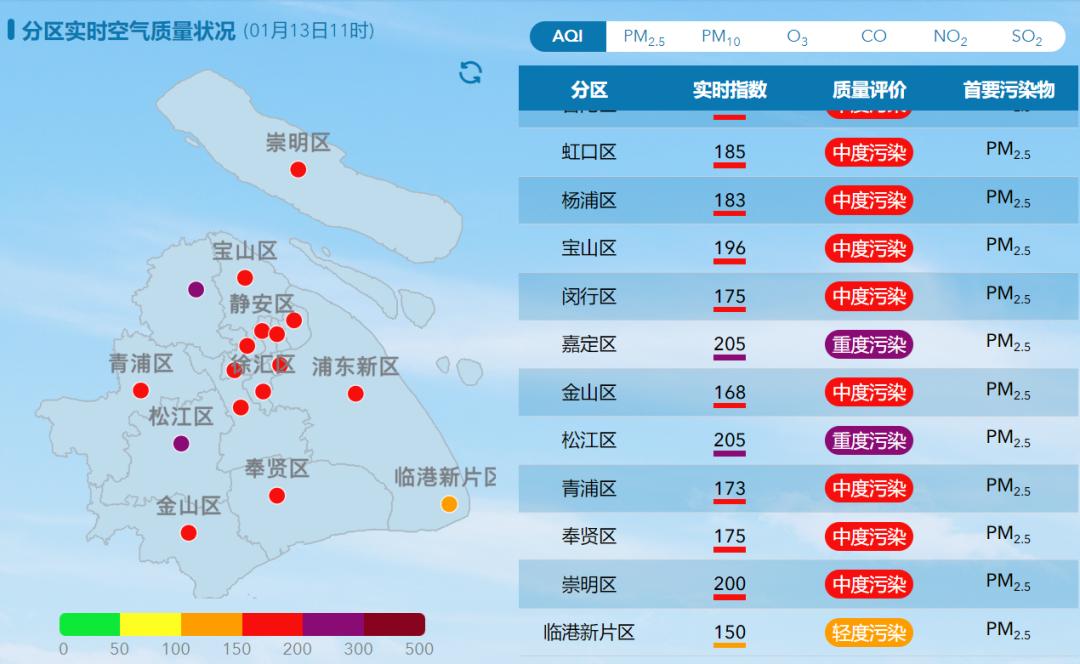 今早11时,除了临港新片区处于轻度污染状态,嘉定和松江两区处于重度污染状态外,其他地区均为中度污染程度。