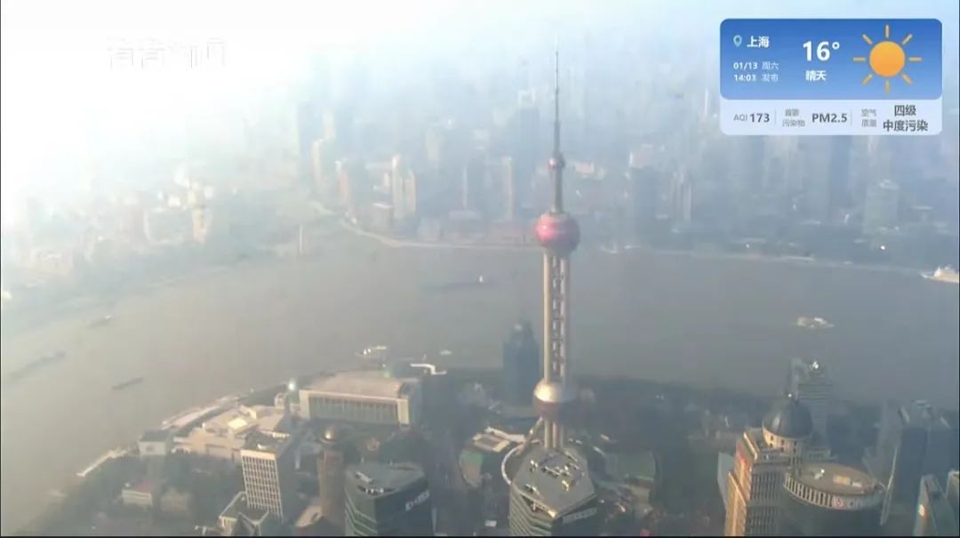 目前,从实景照片看,肉眼就能看到一片灰蒙蒙。上海实时空气质量指数AQI 173,四级中度污染。