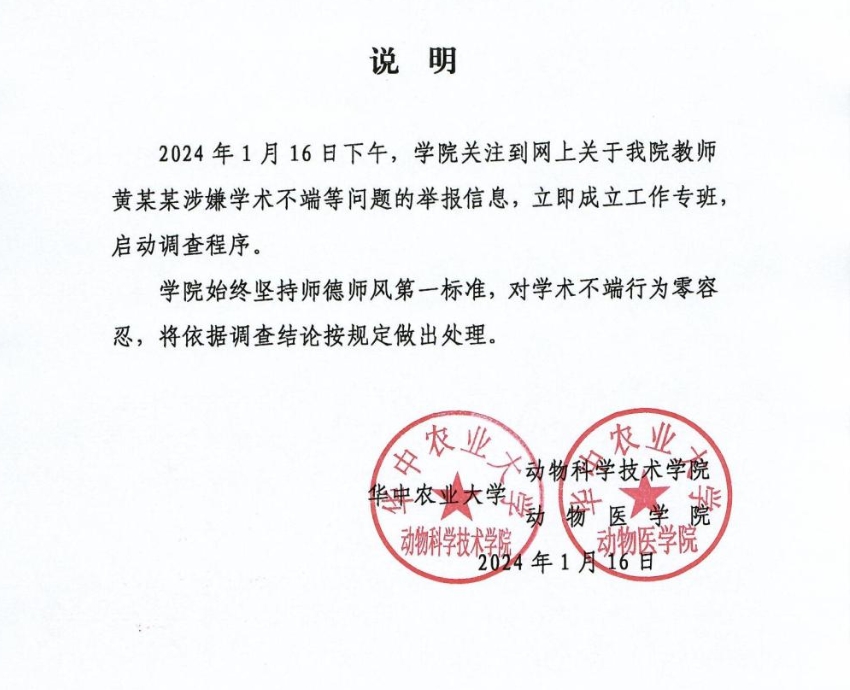 华中农业大学动物科学技术学院/动物医学院16日发布说明称,当天下午,学院关注到网上关于我院教师黄某某涉嫌学术不端等问题的举报信息,立即成立工作专班,启动调查程序。学院始终坚持师德师风第一标准,对学术不端行为零容忍,将依据调查结论按规定做出处理。