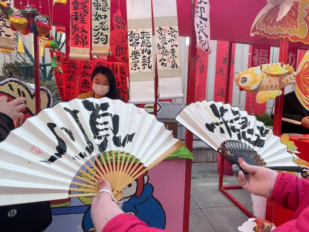 新年新气象,必不可少的春节仪式感便是把家里也装点一番。年味十足的新春装饰,寓意招财、吉祥、平安健康,有年味且不落俗。手写春联也颇受欢迎,不同于常见的印刷品,而是在纸扇、画卷上现场书写简短几个字,一笔一画皆是祝福。“我让她写的一个是‘稳’、一个是‘顺’,寓意新的一年要顺顺利利、稳稳当当。”退休了的郑叔叔告诉记者,以前家门口没有这种民俗活动,这次的活动就填补了这一空缺。
