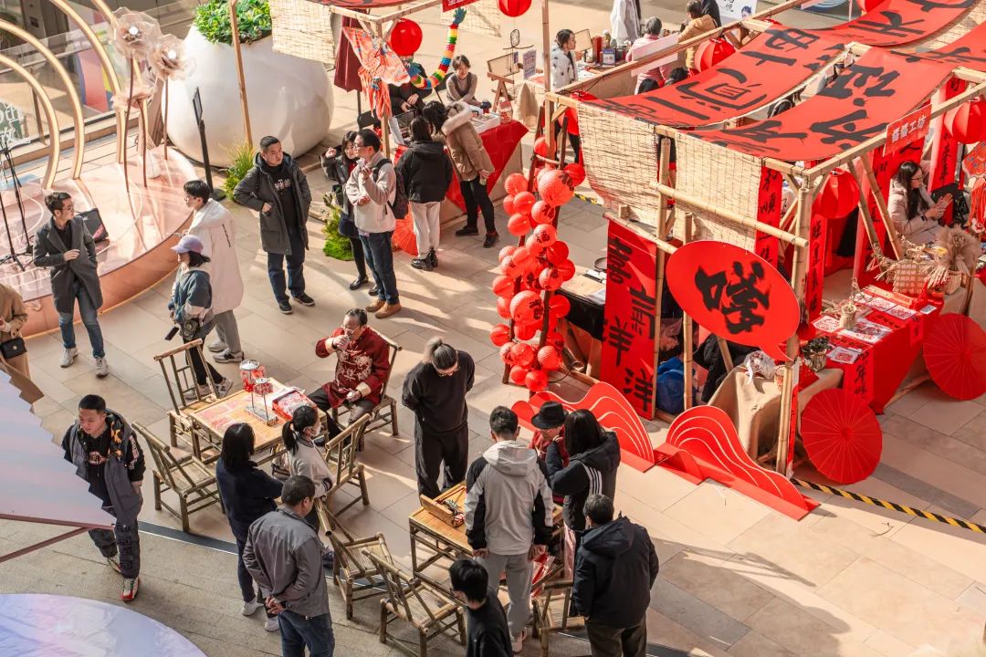 在保利时光里,一场同样具有民俗年味的市集正在举行。幕帘层层展开,繁花处处盛开,张灯结彩。文创、书籍、非遗手作……各式特色摊位随意逛,累了还能坐在藤编座椅上,倒上一壶热茶,享受片刻清闲。
