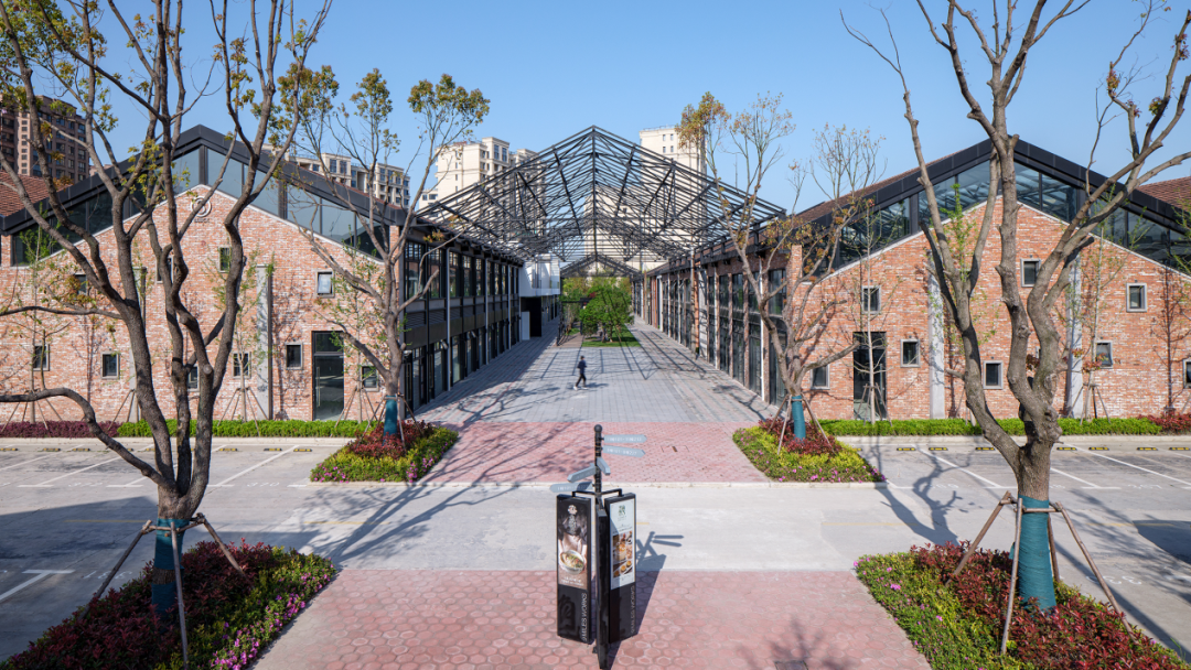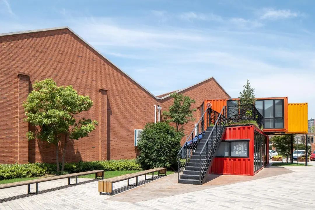 园区建筑以复古红砖墙面为主,走在园区内就像走在了专属秀场,两侧是风格统一的工业风建筑,同时别具匠心地引入集装箱模块与现有的厂房建筑产生联系,增加视觉对比冲突,创造趣味空间,独特的建筑风格不失为来松江旅游不错的打卡点之一。