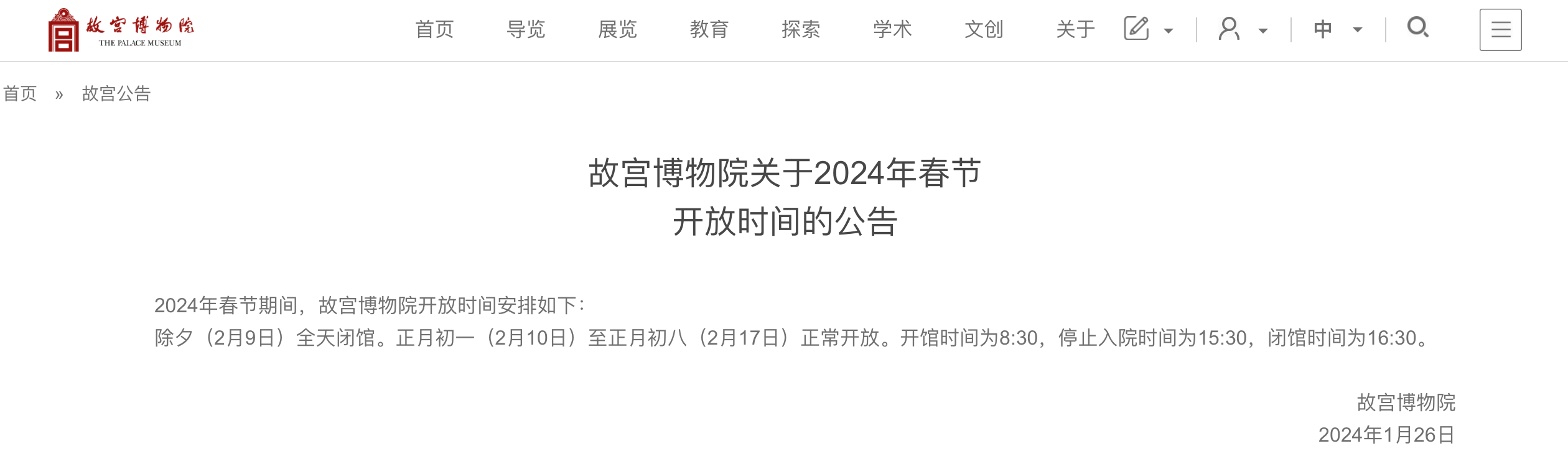 故宫博物院网站2024-01-26 16:43:00