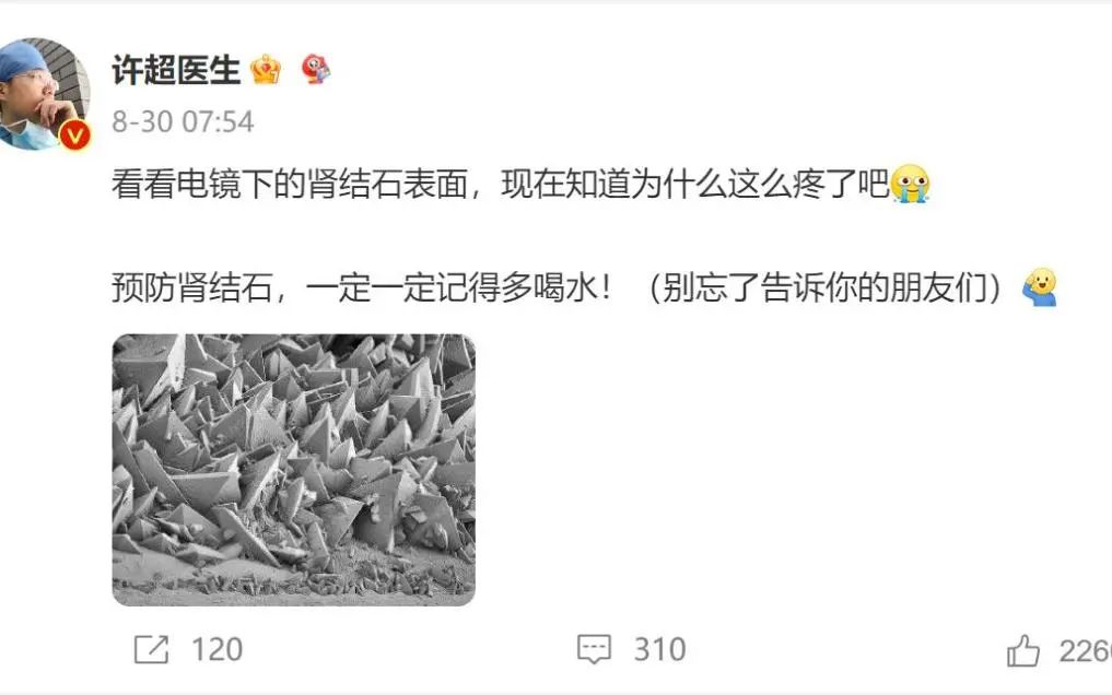 多喝水有利于排尿,能促进小如细沙的结石(小于1厘米)排出体外,减少其在肾脏或尿道形成大结石的风险。