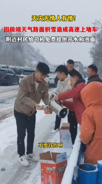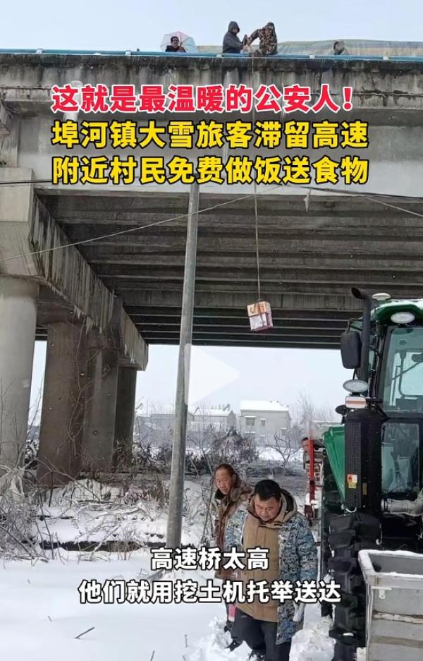此外,据湖北公安县融媒体中心2月5日消息,4日上午,公安县埠河镇代市村的高速路段出现部分滞留车辆和人员滞留,热心的代市村村民们在村党支部书记的呼吁下,纷纷行动起来,有人烧开水、有人煮米饭、有人蒸香肠,冒着严寒的天气为滞留群众送去食物。因为高速桥离地面较远,村民开来挖土机将食物托举送达。