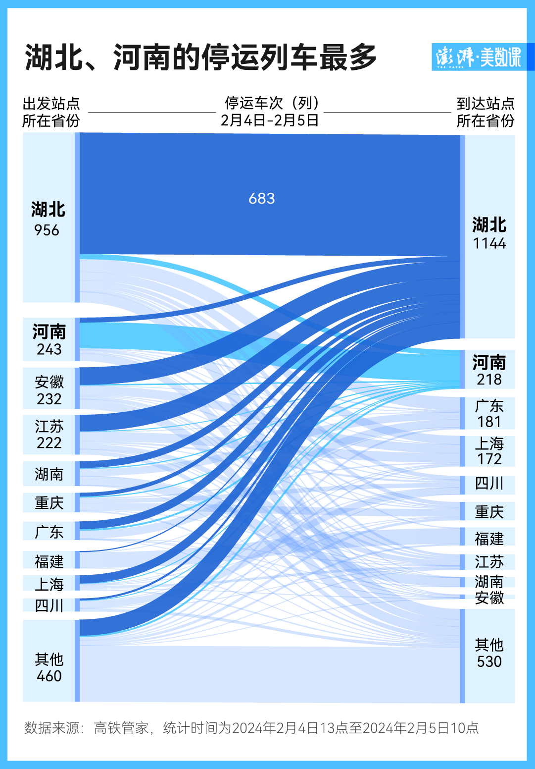 吴宁家所在的岳阳市毗邻湖北省,而湖北是此次冻雨灾害的中心,也同样是此次列车停运的重灾区。2 月 4 日、2 月 5 日的高铁数据显示,湖北的出发和到达列车都出现大面积停运的情况,分别有 956 趟和 1144 趟。