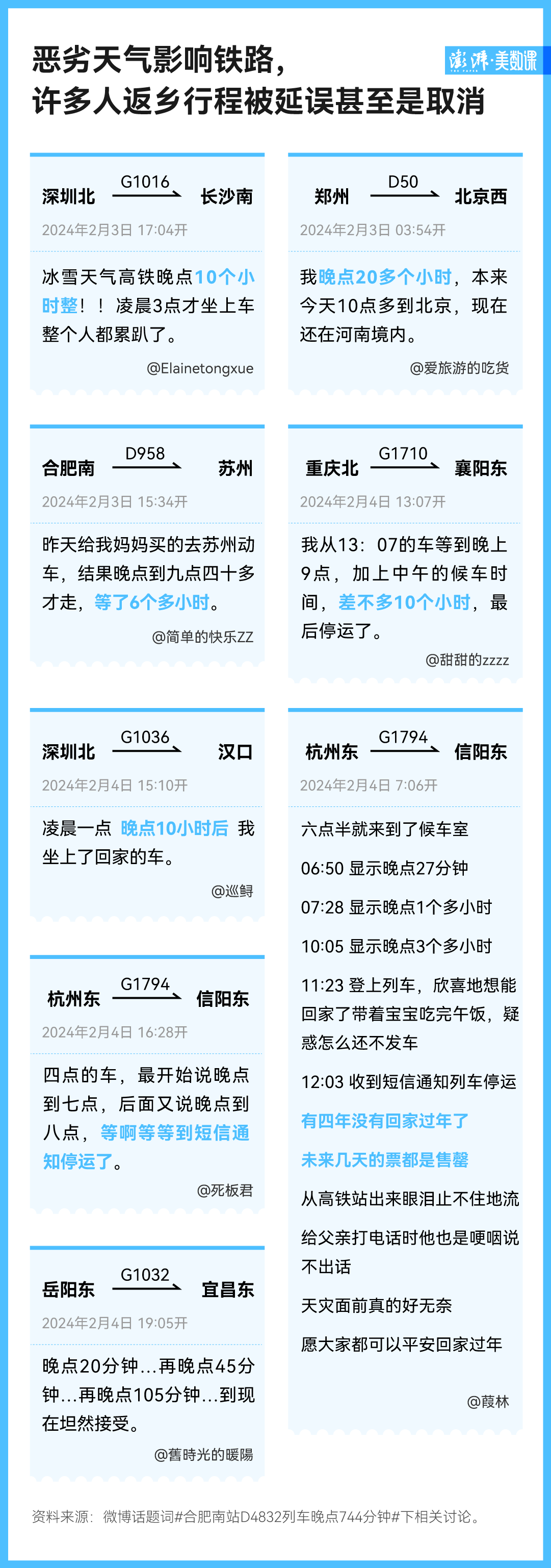 在微博话题“合肥南站D4832列车晚点744分钟”下的评论,我们能看到有些人碰到了比 12 小时更久的晚点。