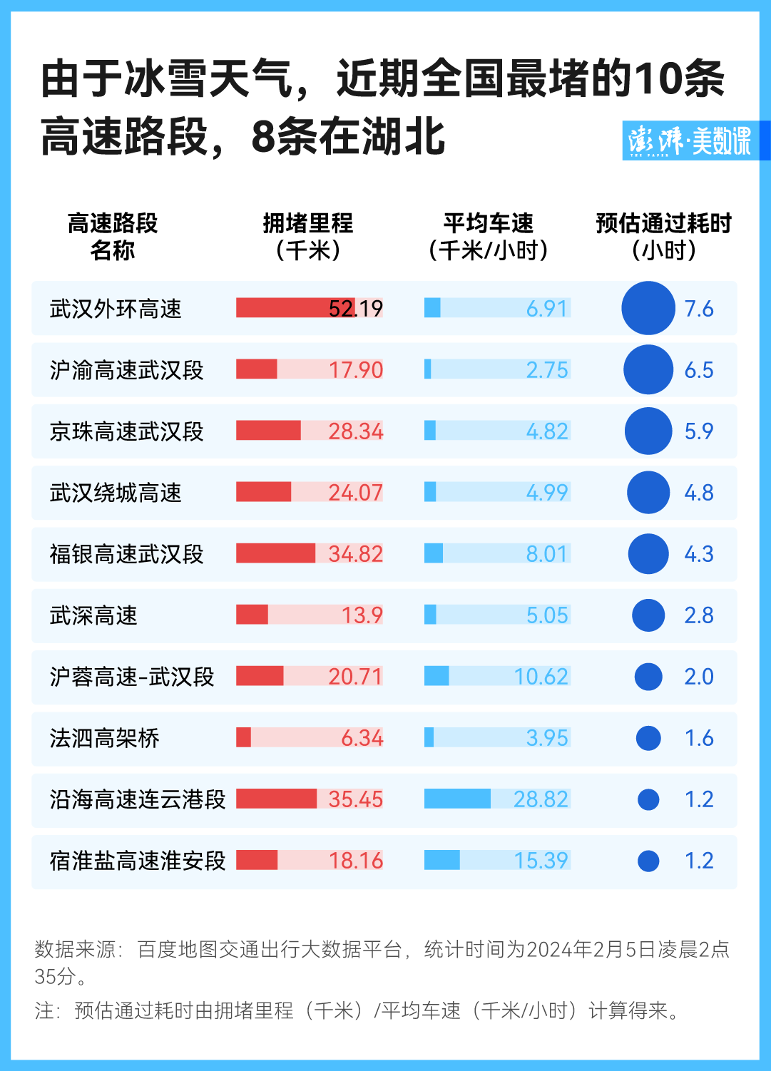 其中最堵的,是武汉外环高速——拥堵长度长达 52.19 千米,车流的平均行进速度只有每小时 6.91 千米。这意味着走完这段路预估要 7.6 小时,而平常只要半个多小时就能开完。
