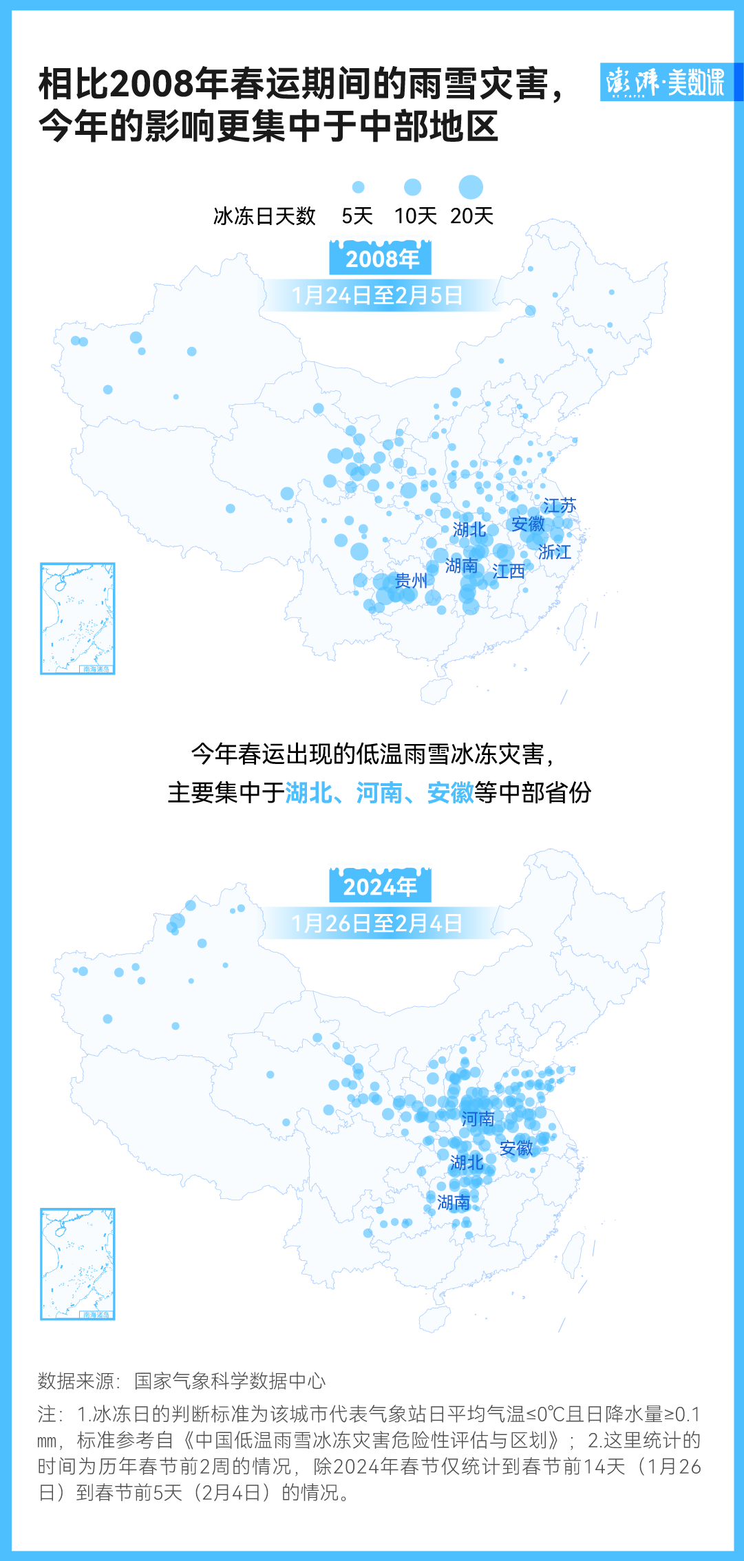 如果把各地的冰冻日数据平铺到地图上,我们会发现,这次的雨雪冰冻天气集中在中东部地区,比如湖北、河南、安徽、湖南,而在 2008 年,冰冻天气的受灾地整体要更偏向南方。