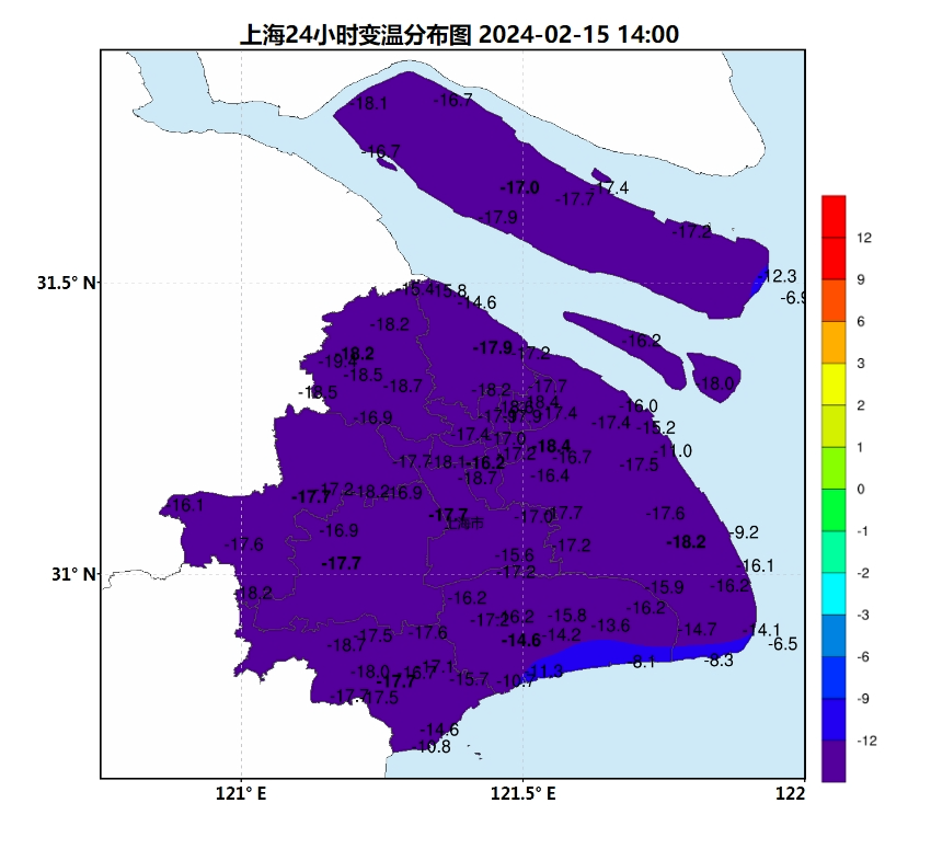 受冷空气影响,今天白天的最高气温出现在8点,市区徐家汇站10.8度,白天气温一路倒挂,14时气温和昨天同期相比直降17度;最低气温将出现在今晚,预计只有4度左右。今天风力明显增大,上海中心气象台今早发布大风蓝色预警信号,目前“寒潮”+“大风”双蓝预警维持,预计今天夜间风力减弱。