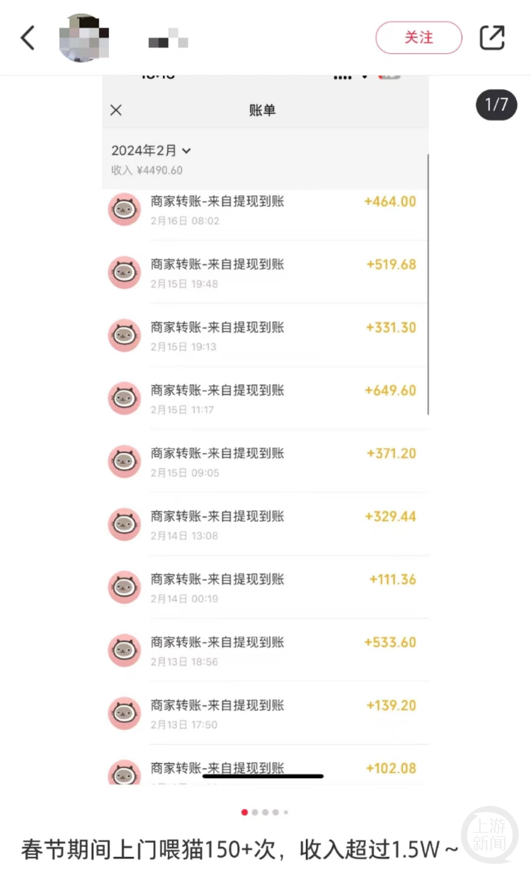 春节期间,除了上门做饭的厨师收入不菲,另外一个群体也引发大家关注,那就是上门喂猫喂狗等宠物的“铲屎官”。近日,有网友在某社交平台上发帖表示,自己春节期间上门喂养宠物150多次,累计收入1.5万元,引发网友关注。当事人游女士(化名)告诉上游新闻(报料邮箱baoliaosy@163.com)记者,自己平时在北京有正式工作,上门喂养宠物属于兼职。“我做这个是为了挣钱救助流浪猫,有这个收入会有底气很多。”