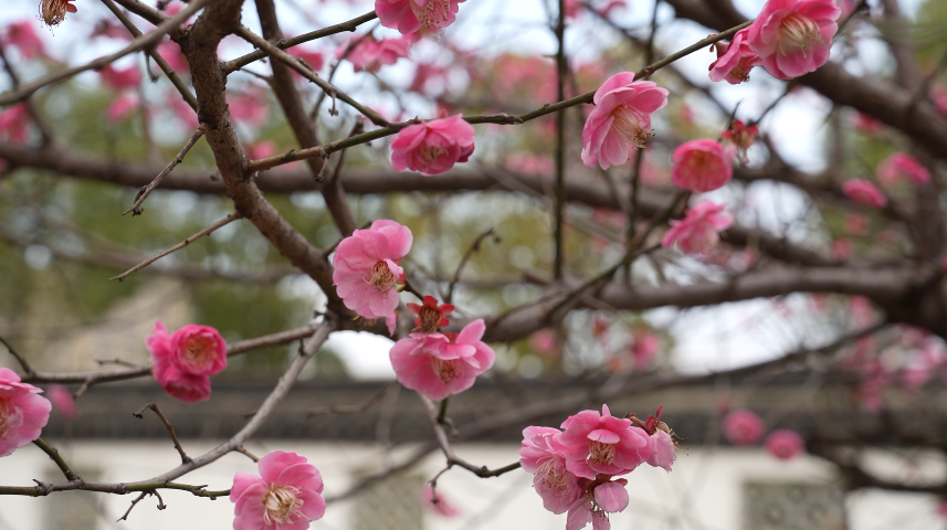 二十余株红梅,以一种热烈而奔放的姿态,宣告着春天的到来。朵朵梅花娇艳可爱,嫣红深邃吸引眼球。