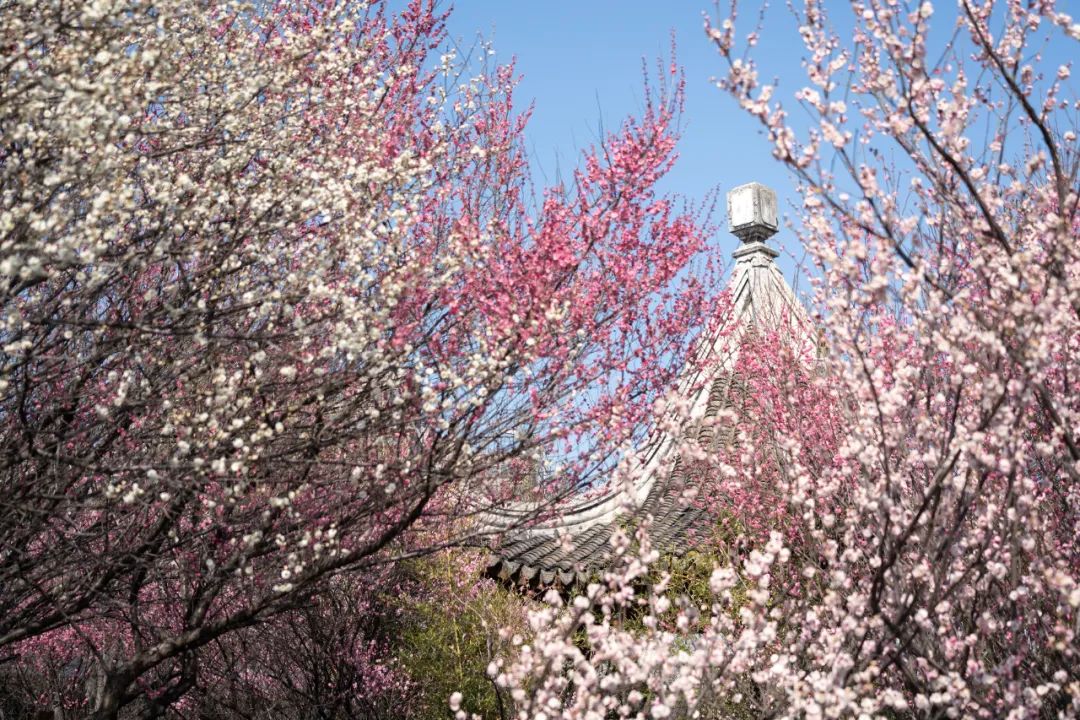 红梅相伴的是几株白梅,它们洁白如雪,清新脱俗。白梅的花瓣如同细腻的玉雕,透出一种清雅与高贵,为鹤槎山增添了一抹清新的气息。