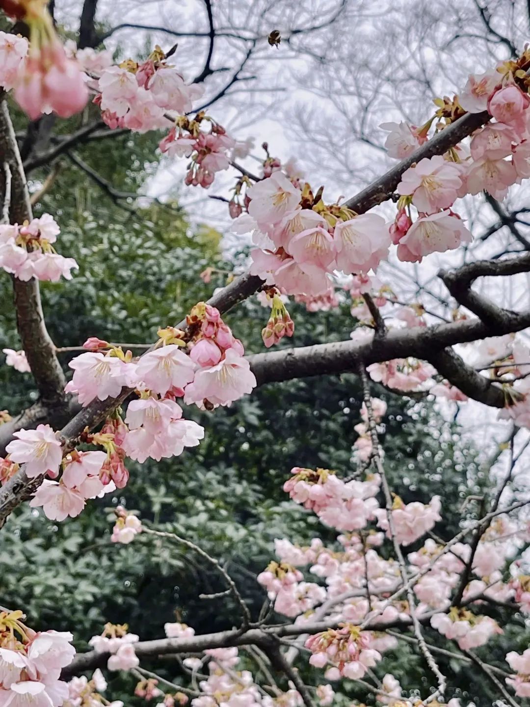 静安雕塑公园的樱花大道位于靠近石门二路的一号门广场,共种植樱花树70余棵,目前开放的品种为大寒樱,满树花蕾和花瓣在春雨的沐浴下更显饱满剔透。