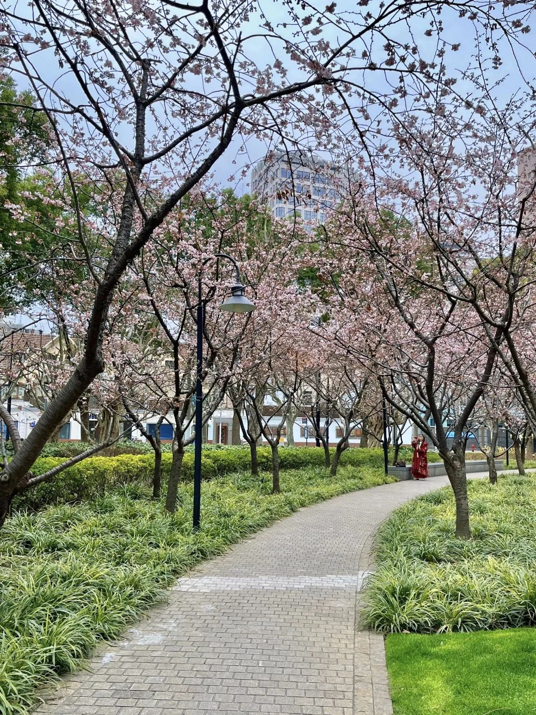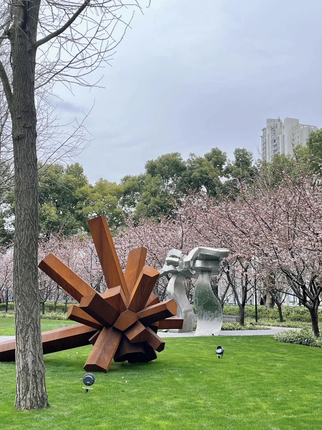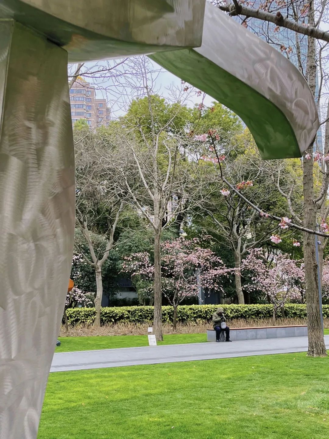 走过一个路口来到静安雕塑公园,远远便看见成片的樱花缤纷盛开如云霞,春色溢出了园外。