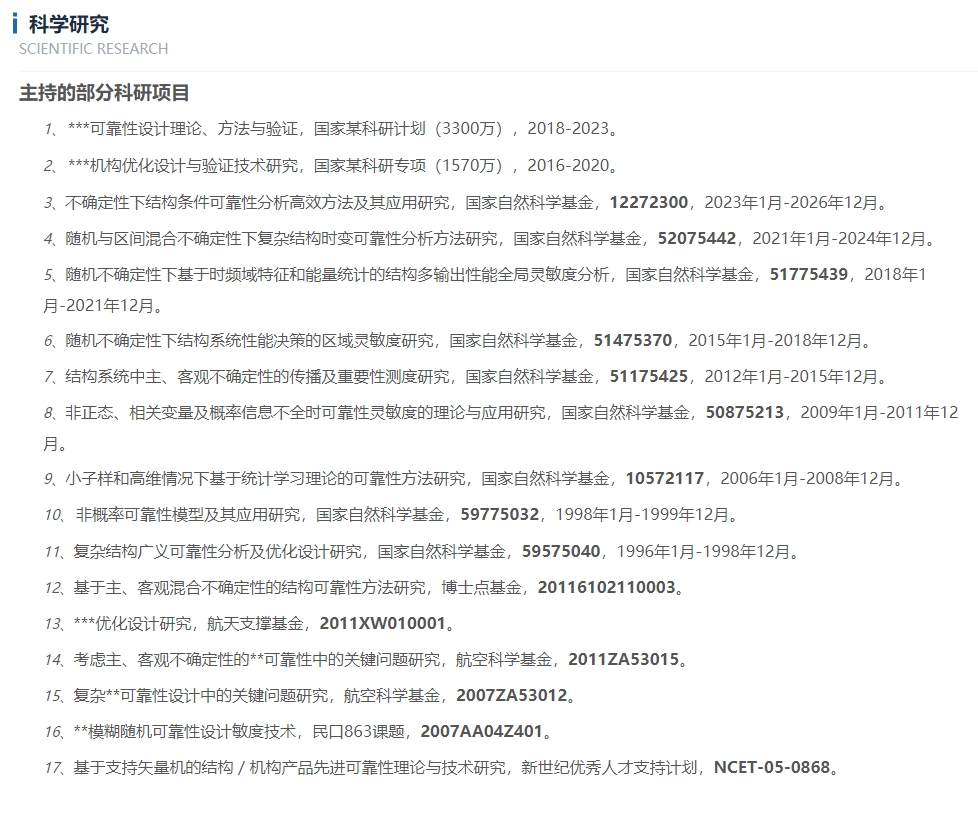 西北工业大学航空学院教授吕震宙的教师个人主页所列科研项目。