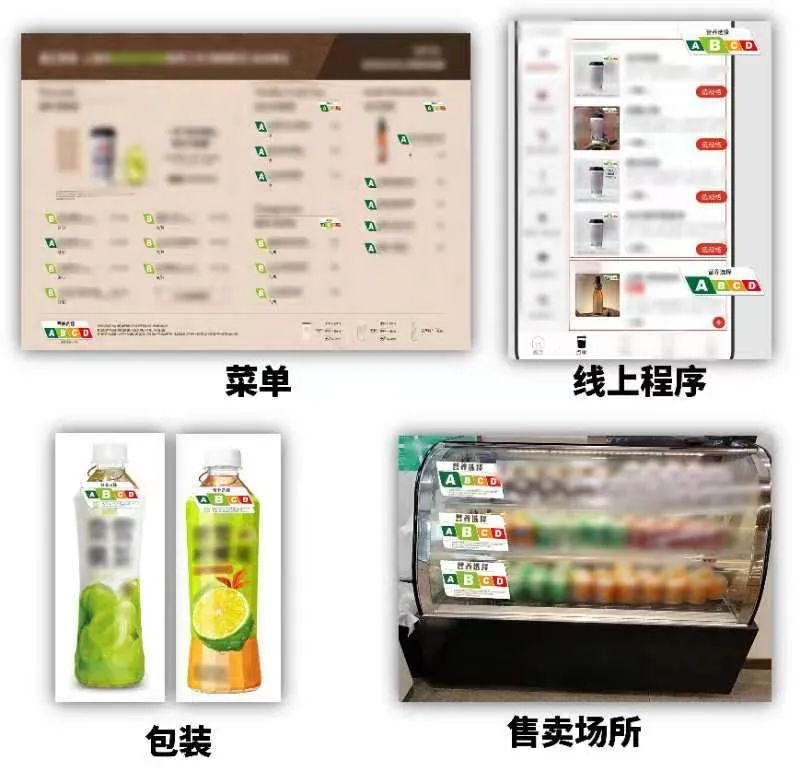 “营养选择”全标识会出现在饮料包装、点单程序、菜单等场景,放大的字母对相应的等级。