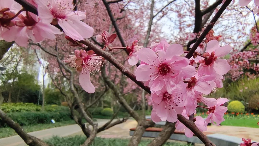 樱花广场的樱花已经悄然绽放,美人梅也在风中摇曳生姿,在粉色花海中跑步真是一番别样的享受。