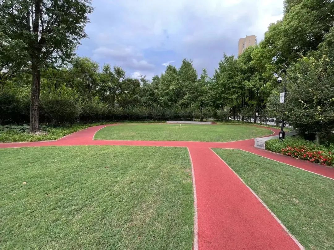 在静安雕塑公园,除了红橙黄绿粉的各色花海,还藏着总面积约930平方米的市民健身步道。