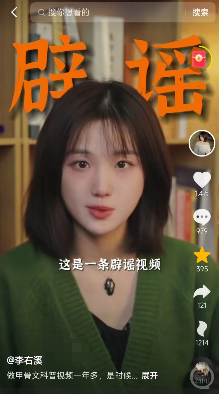 按照李右溪的提示,记者在网上进行了搜索,发现这些不实传闻来自“扶苏聊历史”、“老李财郑”、“简读视觉”等自媒体。有的在文中写道:“李右溪,中国唯一的甲骨文大学生”“她曾经在研究生期间,成功破译了一个甲骨文单字,为此获得了10万的奖金”,有的则是夸张描述:“不仅在研究生期间,李右溪靠破解1个甲骨文得到了10万元的奖金。如今更是收了几十万名‘学生’来一起学习甲骨文。”