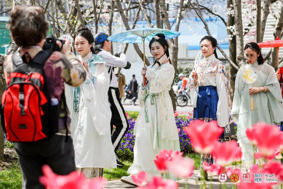 身着从秦汉至明清、民国、新中式等各式传统服饰的汉服爱好者和白领们,他们或手握长笛、或撑着纸伞、或摇着团扇,在花团锦簇的滨江大道款款而行,走进梦幻花海般的琴键春园,与市民游客近距离互动,演绎着不同时代的故事。