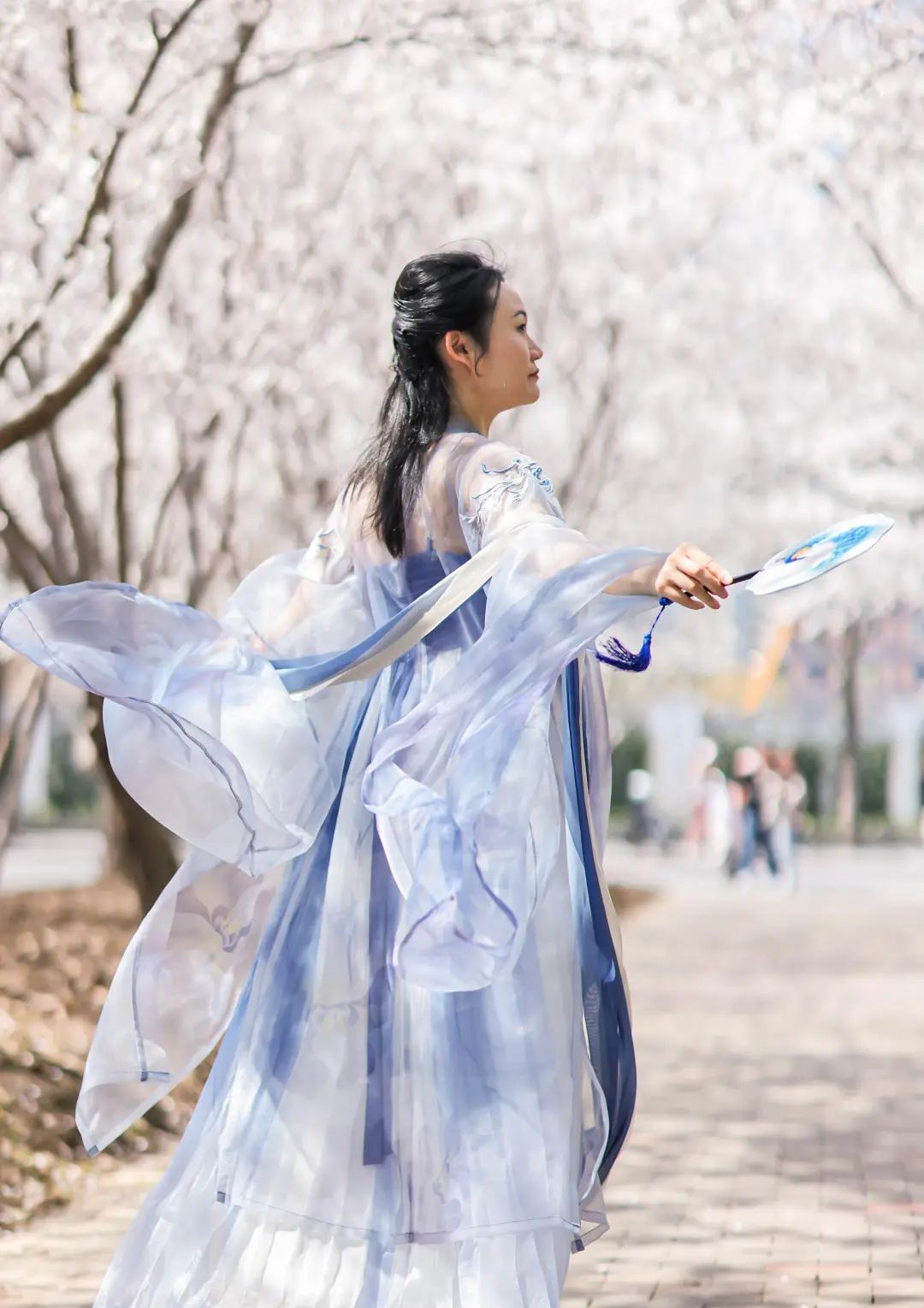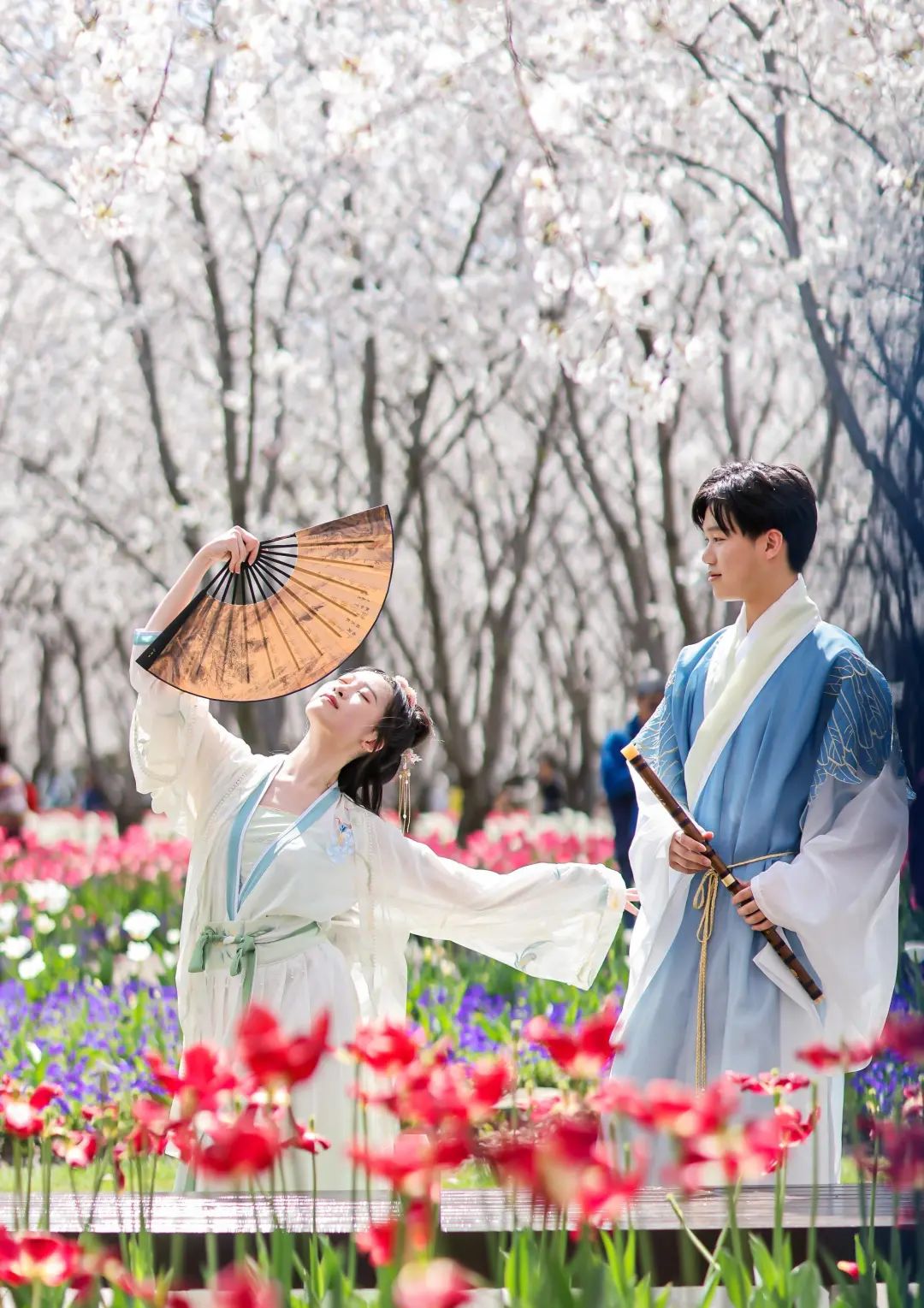 3月末的琴键春园,一旁是娇艳动人的郁金香,头顶是大片白色的樱花海。在樱花与郁金香交织的梦幻景色中,空中飘荡着悠扬的古琴声,一场传统服饰秀正在这里上演。
