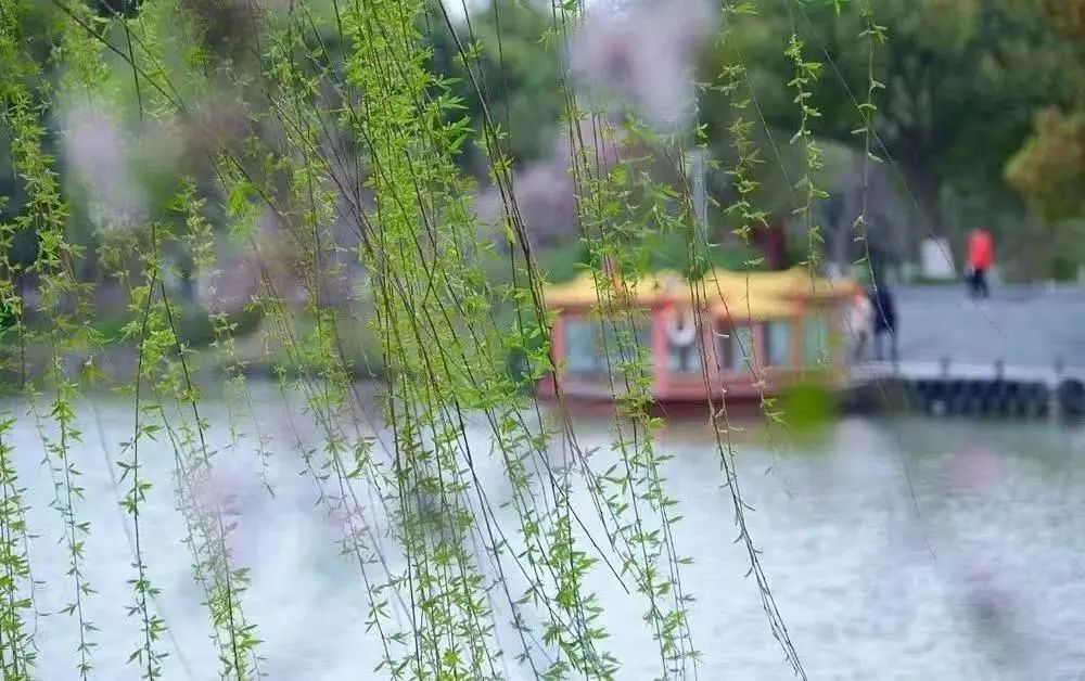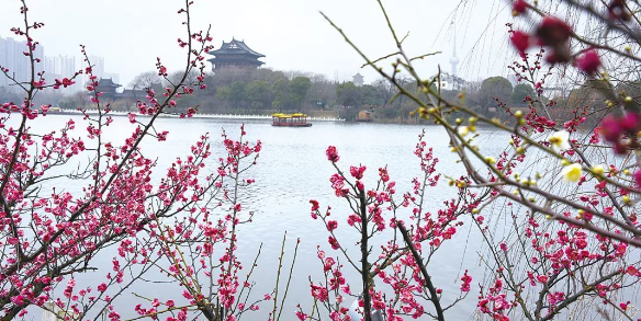 春季的西双湖,红梅盛开,柳树吐穗,一派春意洋洋。