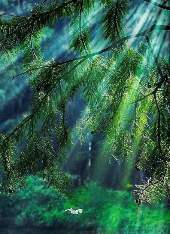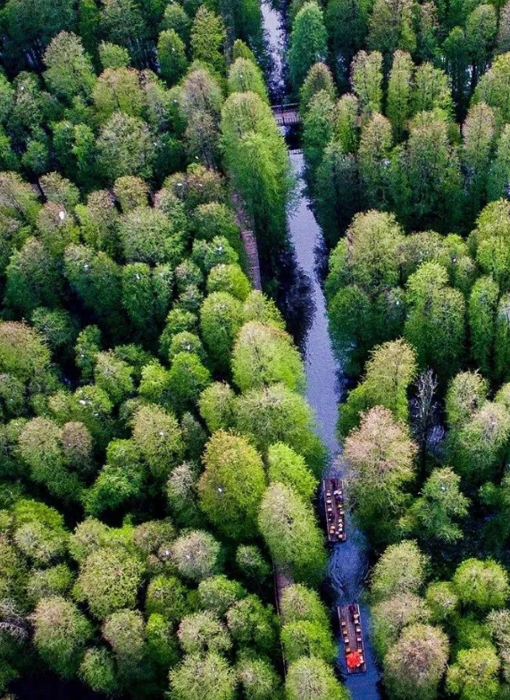 春天的湿地公园,树木高大,生机盎然,林间白鹭筑巢、自由飞翔,竹筏悠然,鸟语花香。
