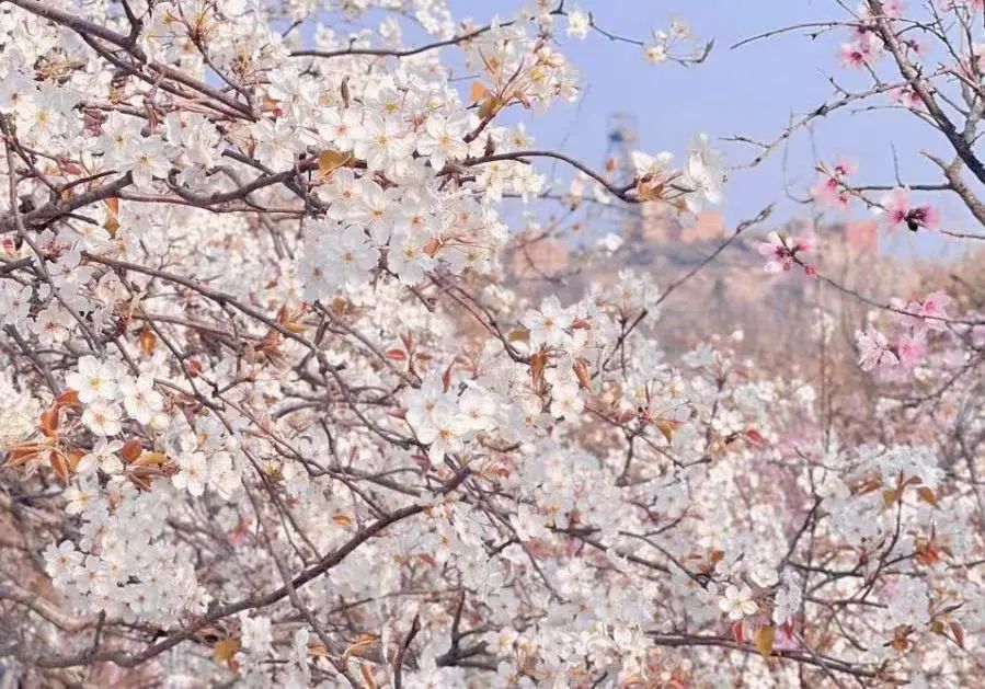 这个春天,不妨来宝塔山公园感受这座城市独有的“镇式浪漫”。园内十多种樱花争相开放,一团团一簇簇,如云似霞,微风拂过,从枝头洒落的粉色“樱花雨”,太适合拍照出片了。