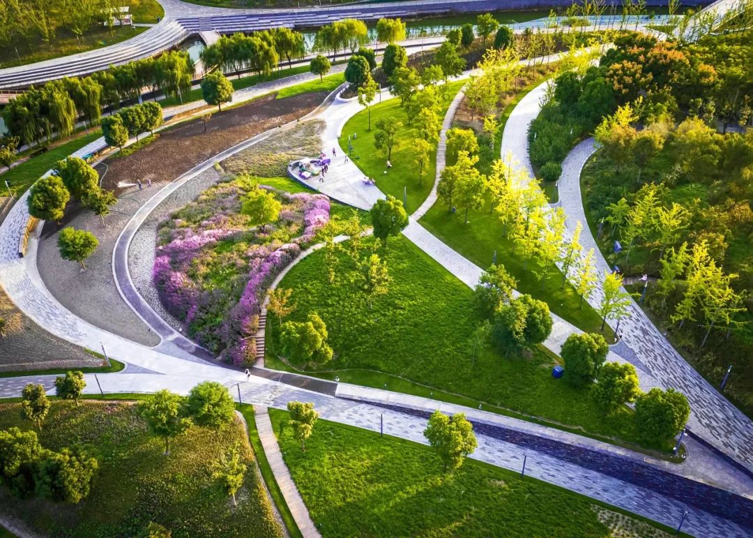桃浦中央绿地占地50万平方米,共6个地块,“J”型布局,是中心城区最大的“城市绿洲”。公园的形态以中国传统书法和舞蹈为灵感,以“Moving Cloud Running Water·行云流水”为概念。公园通过高差、泵站、溢水管、调蓄池、人工湿地等设计,形成绿地内完整的雨洪管理系统,将海绵城市技术应用其中。
