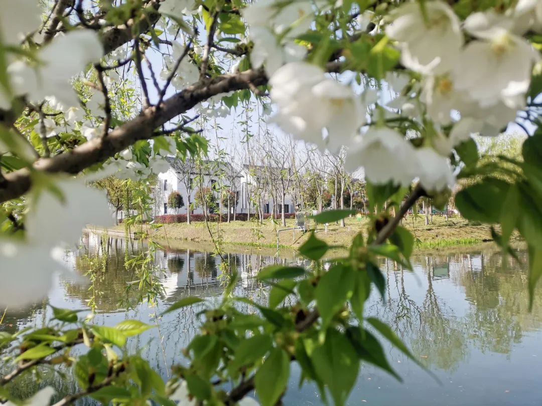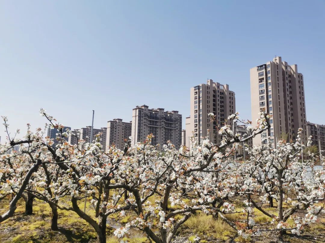 春风阵阵吹开了新联村崧建路和新力支路上一树树洁白温婉的梨花这片约36亩的精致梨园在重固新型城镇化的衬托下仿佛是一幅生动的画卷
