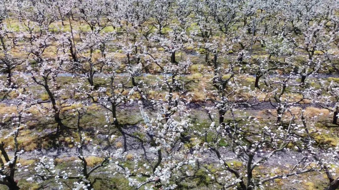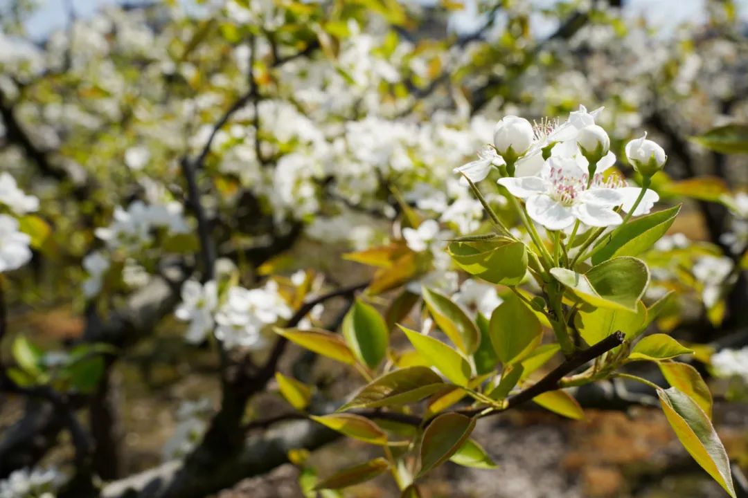 千棵梨树在精心照料下形态整齐而优美多姿在微风中轻轻摇曳成团成簇的梨花挤满枝头宛如白浪起伏漫卷轻飘