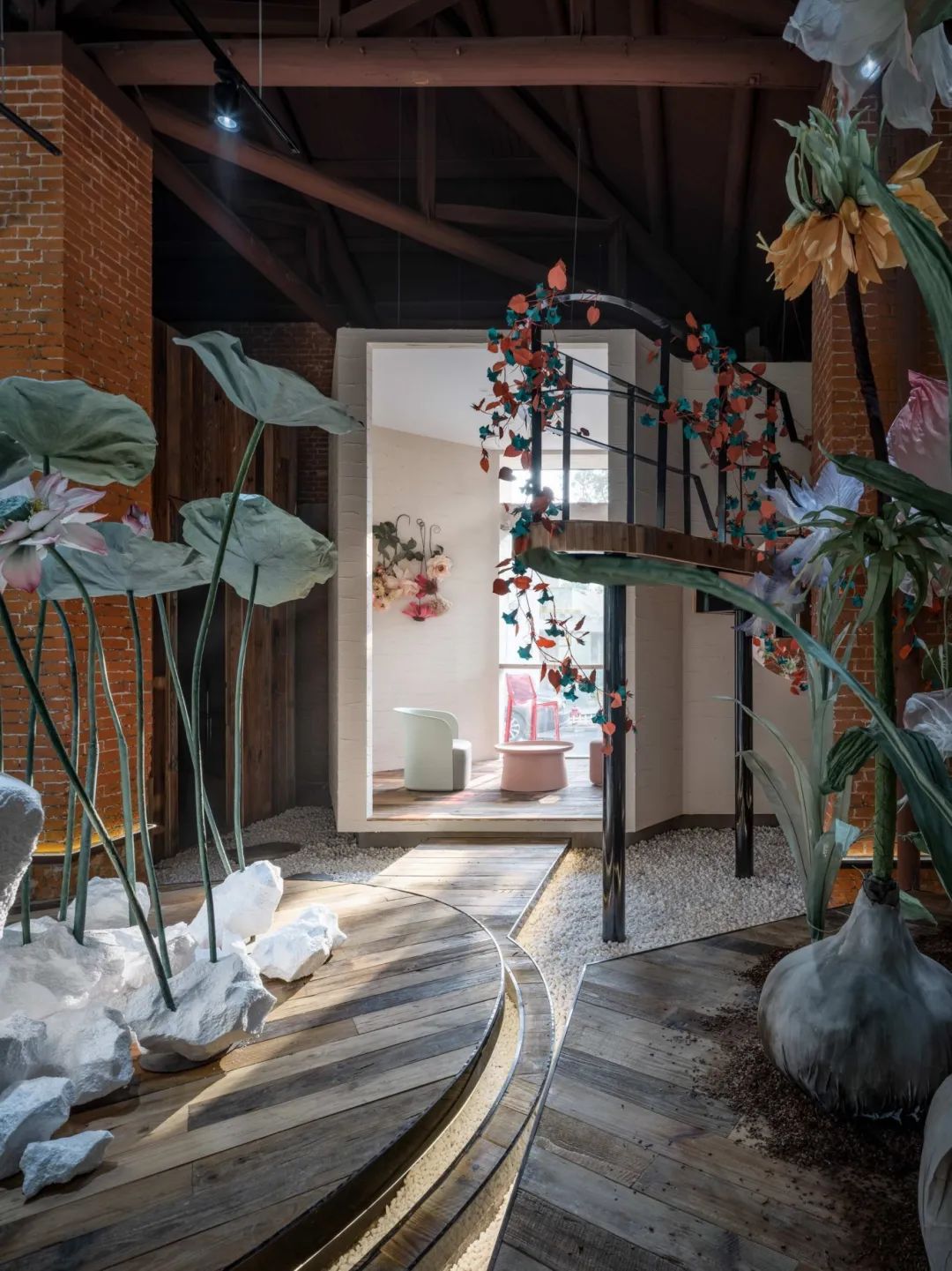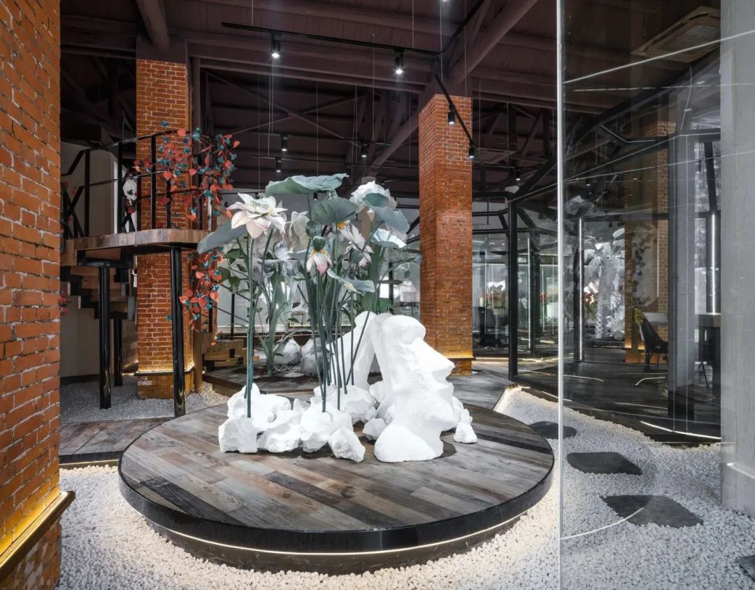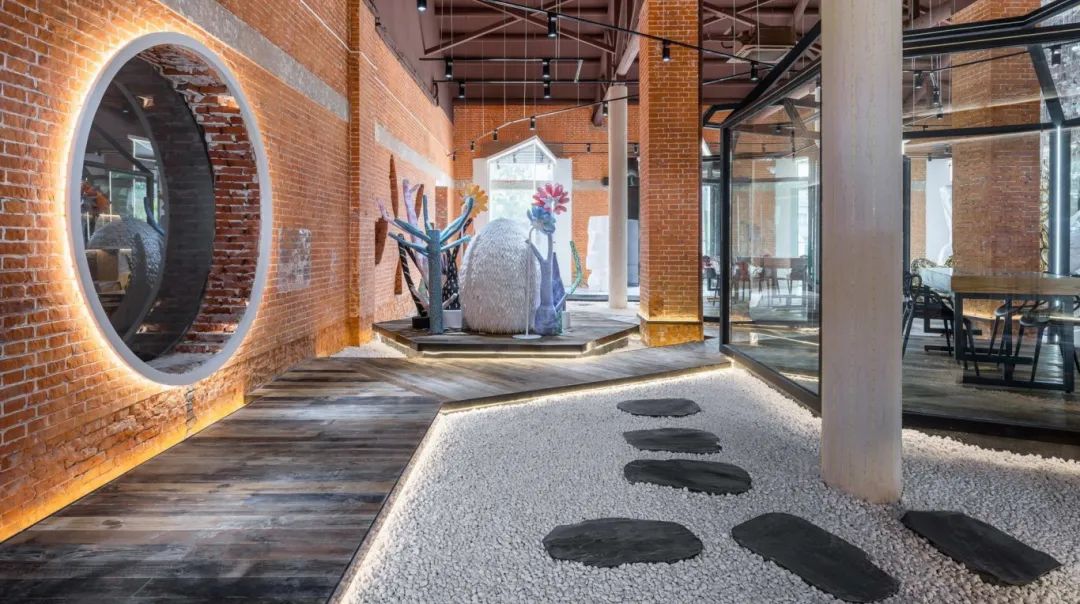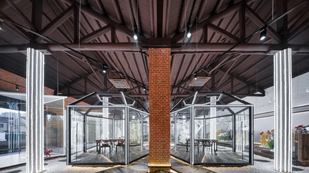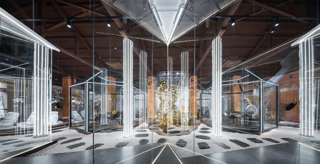 在空间中设置了多个自由变化的几何形态、内部建筑具有7.5m的高度,是整个上海独一无二的双顶连体结构,在视觉上将双顶结构空间统一为整体,也为艺术馆增添力量感,激发着人们的探索欲。
