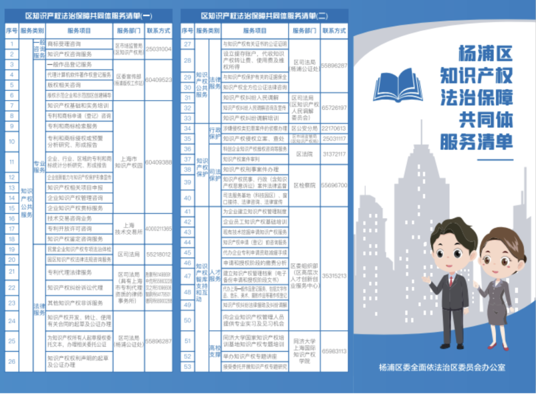 杨浦区知识产权法治保障共同体积极推广常态化“法治体检”,推出滨江公共法律服务清单、创业法律指南,绘制杨浦区公共法律服务地图,发挥律韵杨浦·法律服务志愿团作用,构建企业法律服务快速响应通道,累计为数字经济、建筑工程、物流配送、美容等10余类行业近800家企业出具法治体检报告,满足滨江沿线企业在法律服务方面的实际需求。