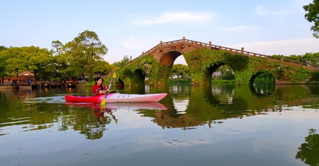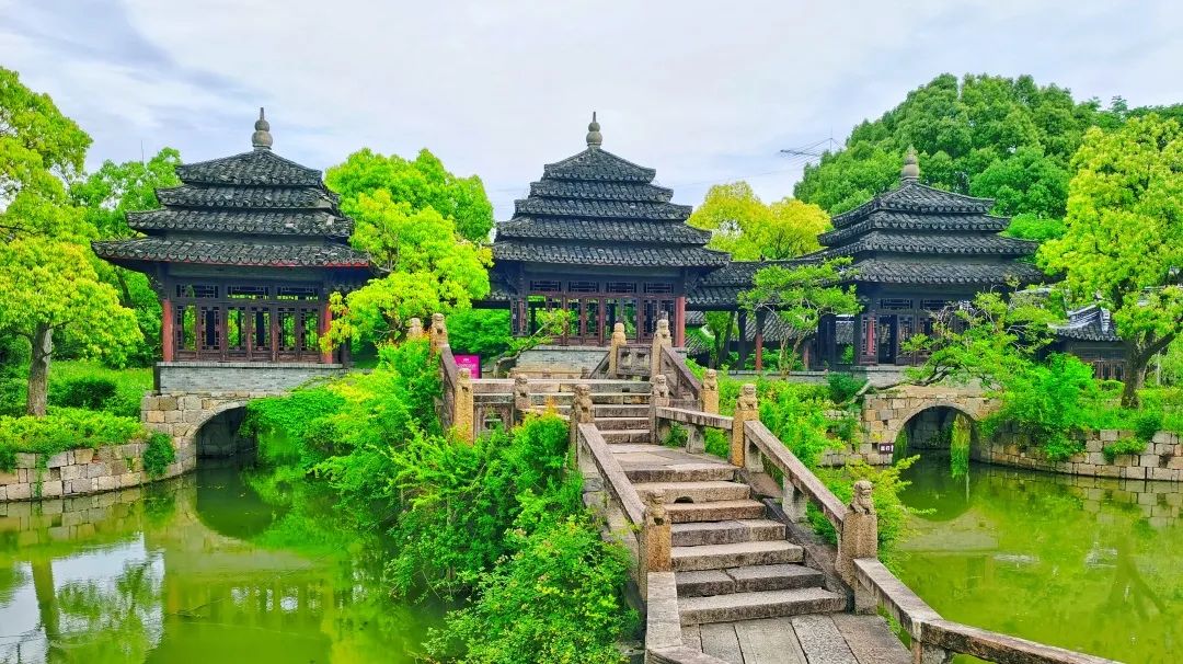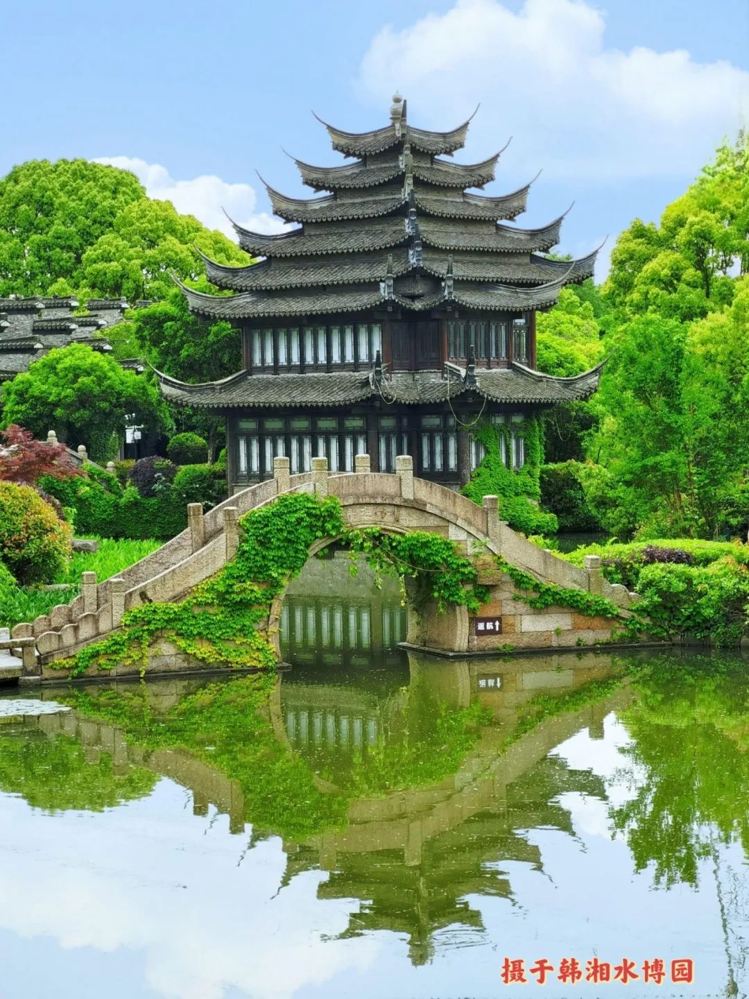 近五十座石桥和仿古桥,或聚集、或散落在园区的各个角落,五孔的韩湘桥、单孔的香泾桥、三孔的醒狮桥,还有跨梁式平桥、曲桥、廊桥,每一座桥都有一段历史、一个故事,让人们在游园中仿佛与历史相伴,与古人同行。园区内长廊、小桥流水间的亭台都以灰砖黑瓦登场,朱红的雕花木格门窗、青砖铺设的地面,处处彰显着传统建筑的精彩。