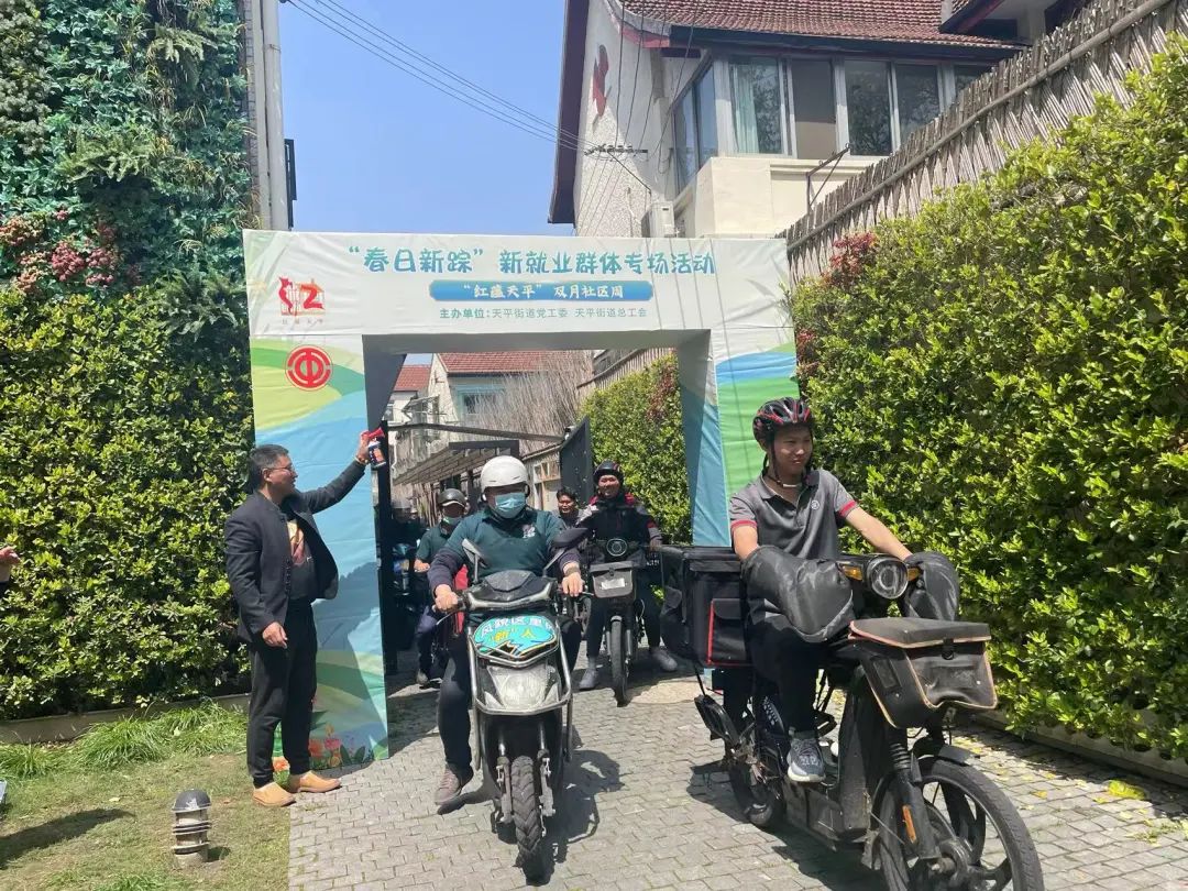 在天平街道嘉园党群服务中心内,随着发令枪声响起,春日骑行正式启动,15名来自新就业群体的参与者骑着电瓶车有序前往第一个点位。