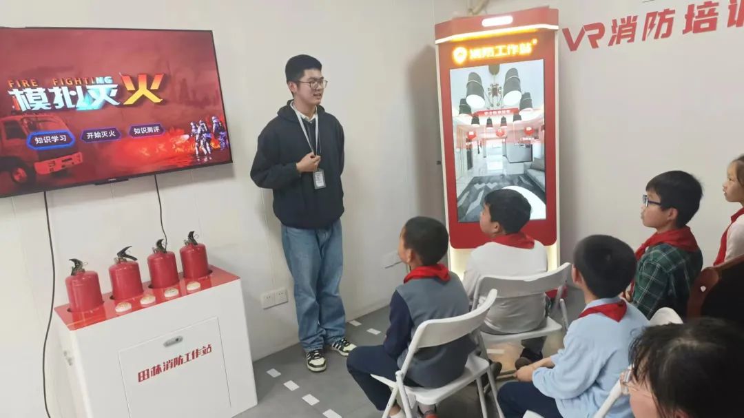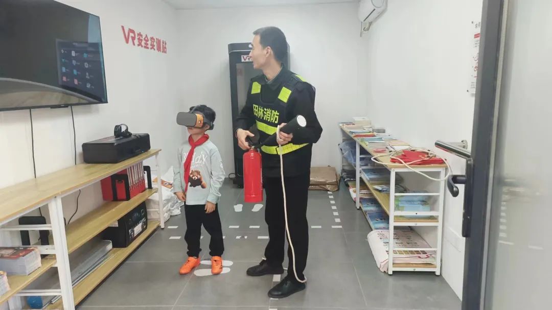 田林街道消防办工作人员携工作站队员,借助微型消防站站点内的VR设备,向同学们讲解火灾预防、灭火器操作等消防安全知识。在工作人员的讲解下,同学们精准地从VR模拟环境中找出家庭火灾隐患,熟练掌握不同灭火器应对不同火灾的知识,正确使用模拟灭火器进行灭火。