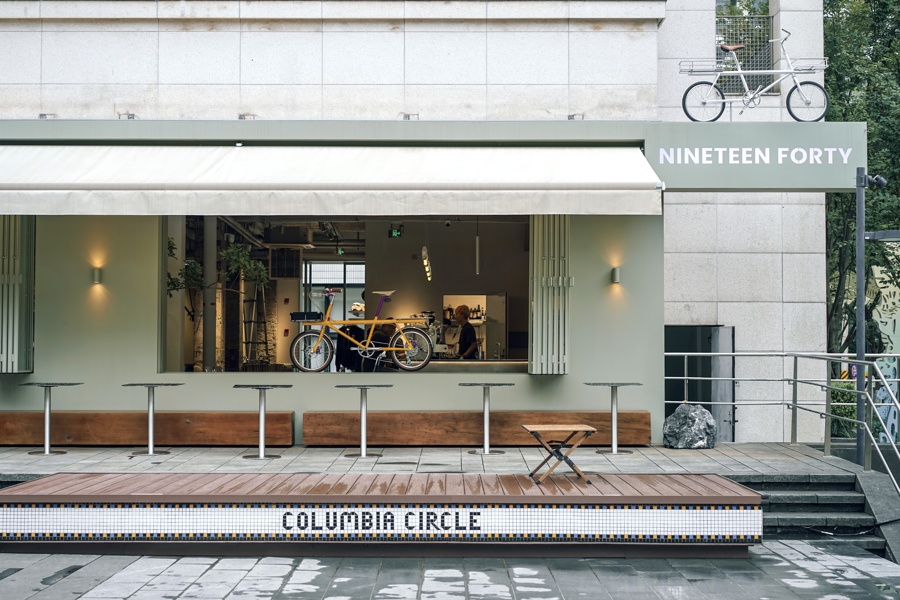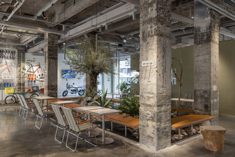 “永久1940”是上海老字号永久旗下的创新自行车品牌,空间里满满的工业风,门把手是修车工具制成的,墙面悬挂着车架,车链条嵌入地面。