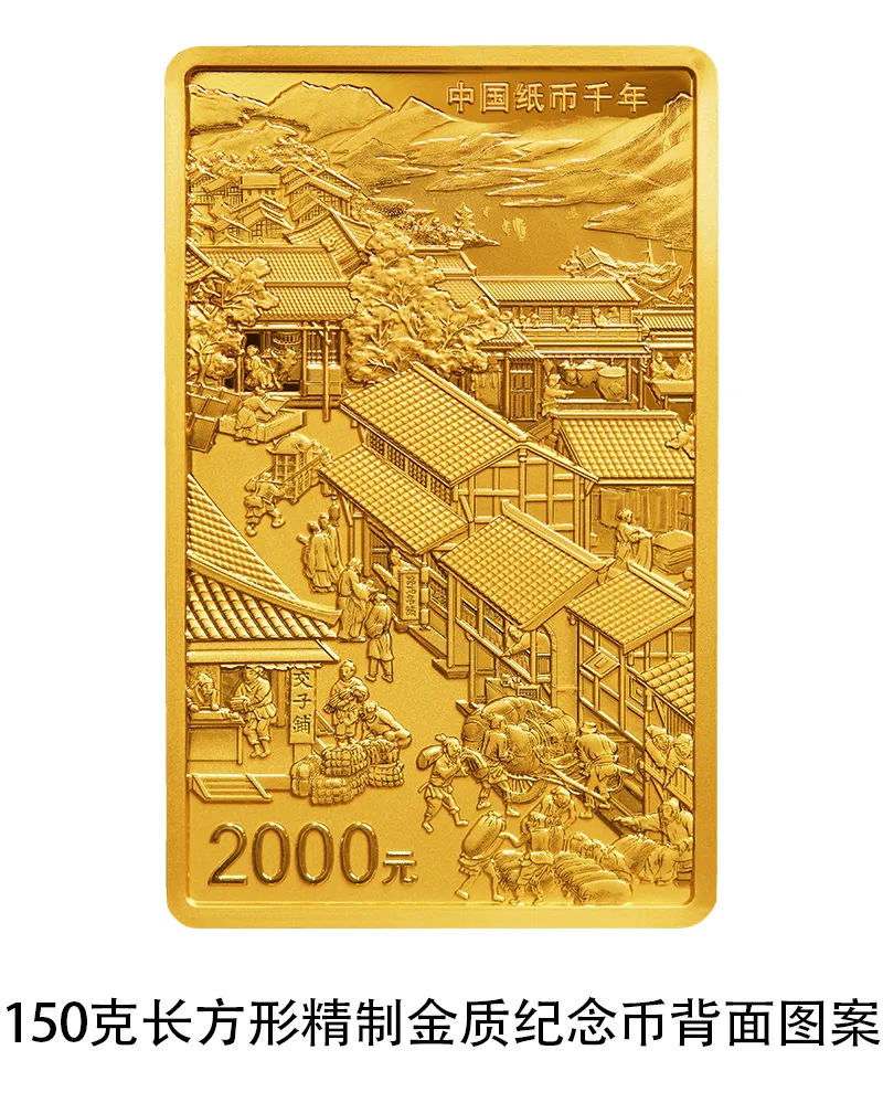 150克长方形金质纪念币背面图案为北宋成都典型市井街巷、商贸活动场景及地域特色景观等组合设计,并刊“中国纸币千年”字样及面额。