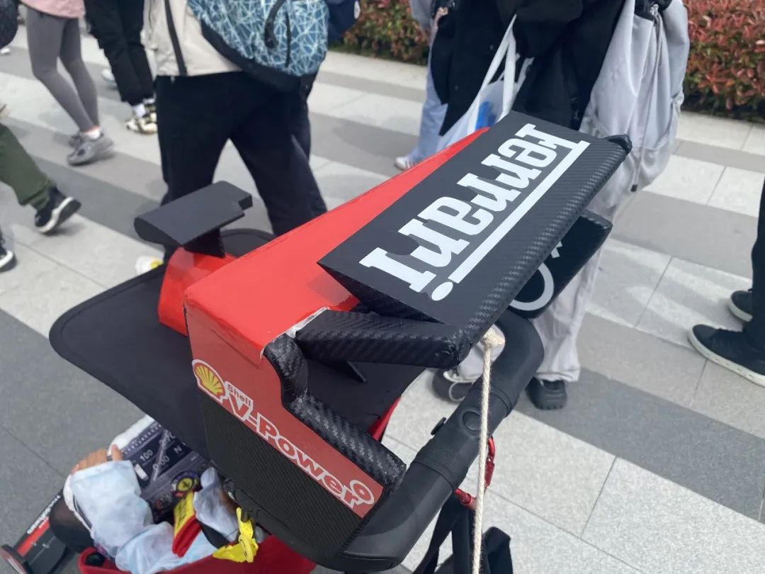 赛车发烧友钟雳先生介绍,制作这辆造型如F1赛车的儿童推车耗时约30个小时。外形上,他用泡沫板和KT板制作基础形状,切割成型后,再用改色膜和碳纤维膜贴装,童车上方的遮阳遮雨平台也制作了进气口和T字架。