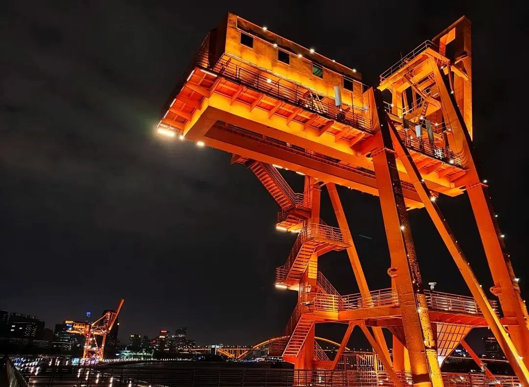 此外,矗立于黄浦江畔的两座橘色塔吊也成为夜间的新亮点。根据塔吊自身的轮廓结构,采用暖色调的投光灯,凸显出其坚毅的钢铁质感。塔身上律动的点光源使得它们宛如熠熠生辉的光之雕塑,既与周围环境和谐相融,又独具特色,吸引了大量游客驻足观赏。