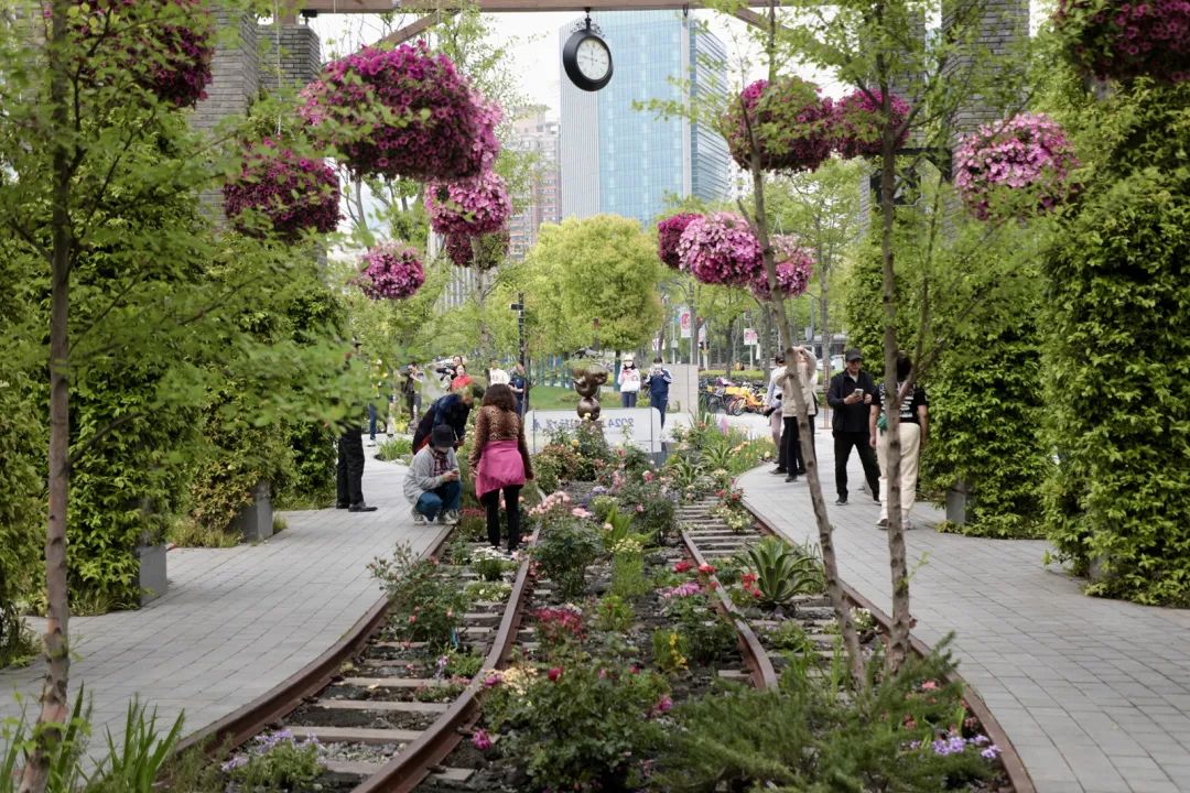 这个“火车站”主题咖啡店,门口两条老铁轨横亘,铁轨间经过设计的“花草丛生”,为这里增添了一抹自然的野趣。电钟、铜铃等元素点缀其中,浓郁的怀旧氛围吸引了很多人前来拍照打卡。
