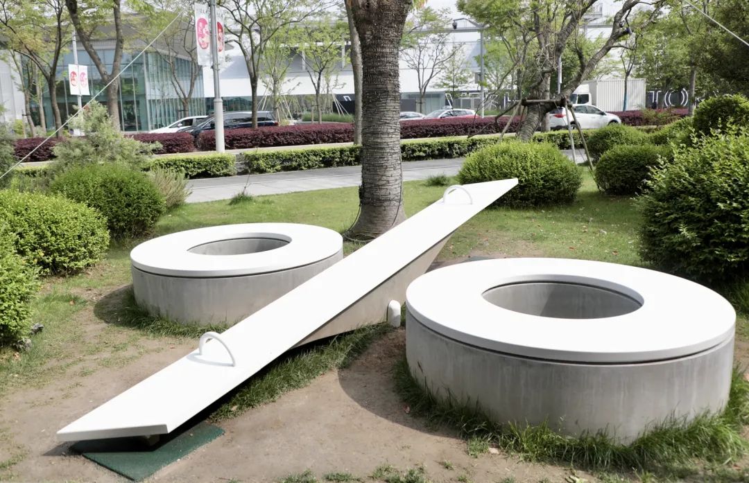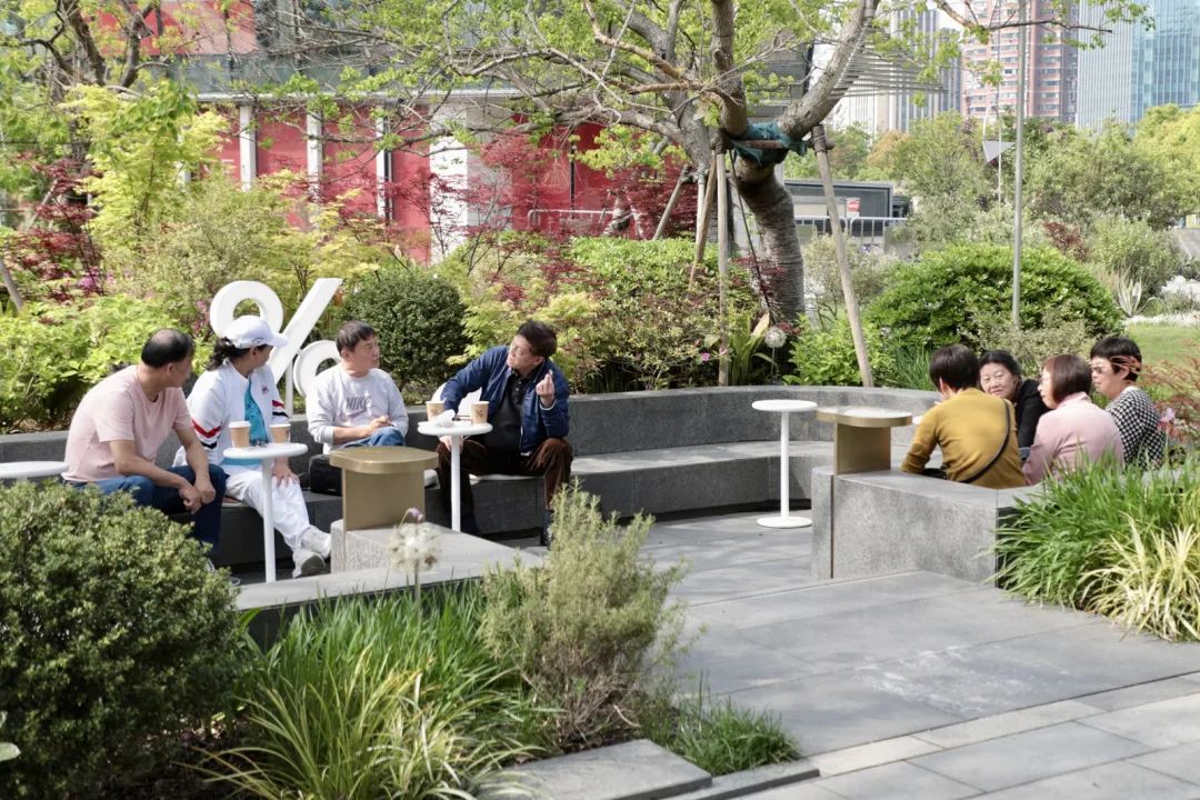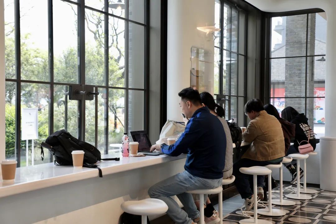 在西岸金融城店,除了推荐在“窗边景观位”喝咖啡,在室外的小花园中也特别设计了座位区。同时,室外的草坪上还颇有童趣地摆着一个巨大的“%”跷跷板。
