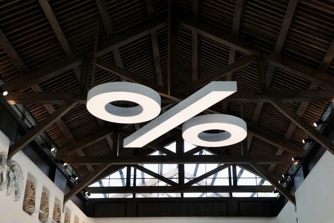 店铺门口的视觉设计同样引人注目。首先映入眼帘的,便是在老建筑的三角形木桁架下大大的白色商标“%”;咖啡店四周是带有老上海风情的大玻璃格子钢窗和落地门;咖啡店的外立面设计也别具一格,钢结构和清水青砖的结合,让人一眼就能感受到它“有关历史”的特别。